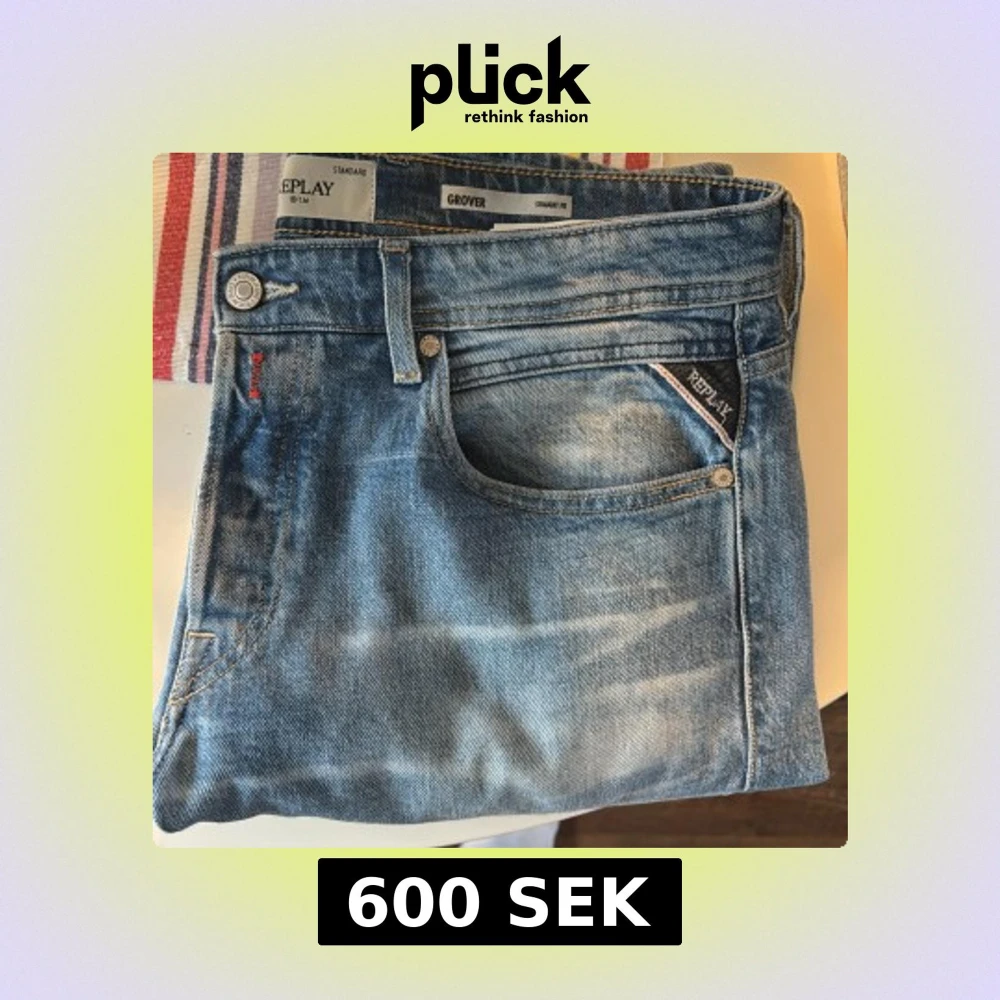 Säljer ett par Replay Grover jeans i ljusblå tvätt med snyggt slitna detaljer. Modellen är straight fit med klassisk femficksdesign och diskreta Replay-loggor vid fickorna. Jeansen är tillverkade i bomull och har en normal passform.