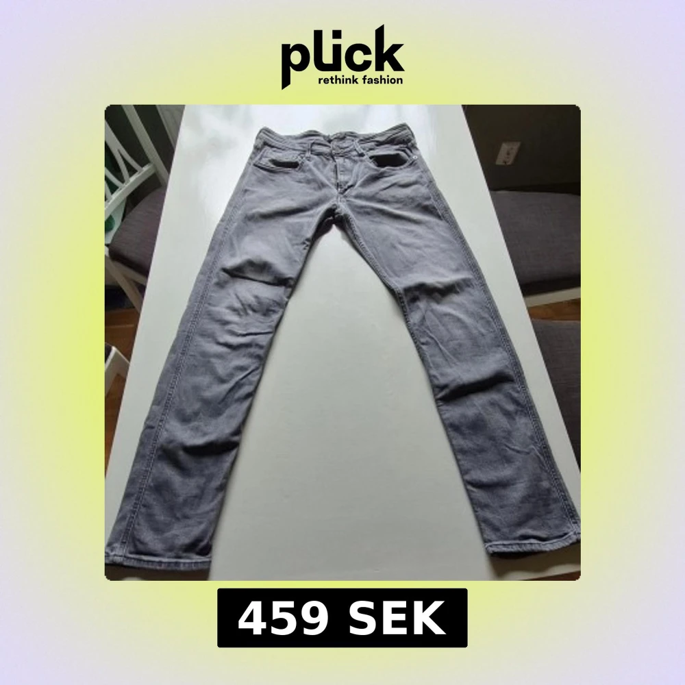 Säljer ett par grå jeansbyxor från Replay med klassisk femficksdesign och raka ben. Byxorna har svarta detaljer vid linningen och en diskret Replay-logga vid bakfickan. Perfekta för en stilren vardagslook. Riktigt stilrena!