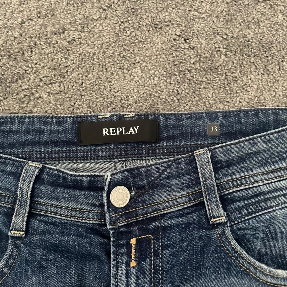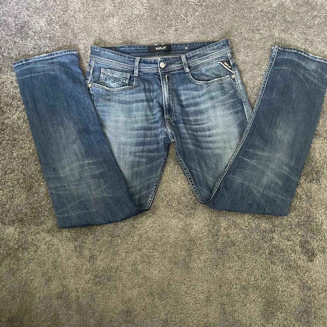 Säljer ett par klassiska blå jeans från Replay i rak modell. Jeansen har snygga slitningar och ljusare partier framtill, fem fickor och tydliga Replay-detaljer på bakfickan och läderpatch i midjan. Hör av er vid frågor eller funderingar. Del av Replay Rocco Comfort Fit linjen och original pris är 1299 kr.