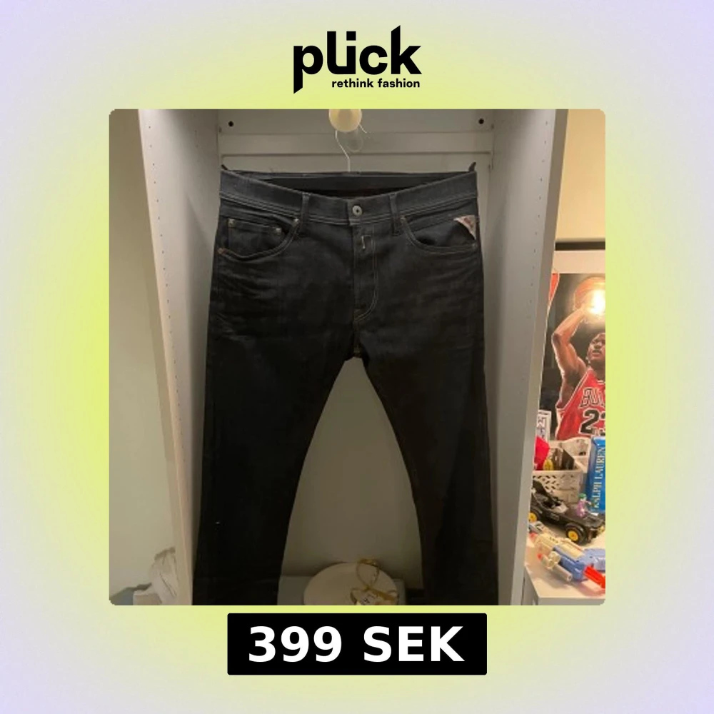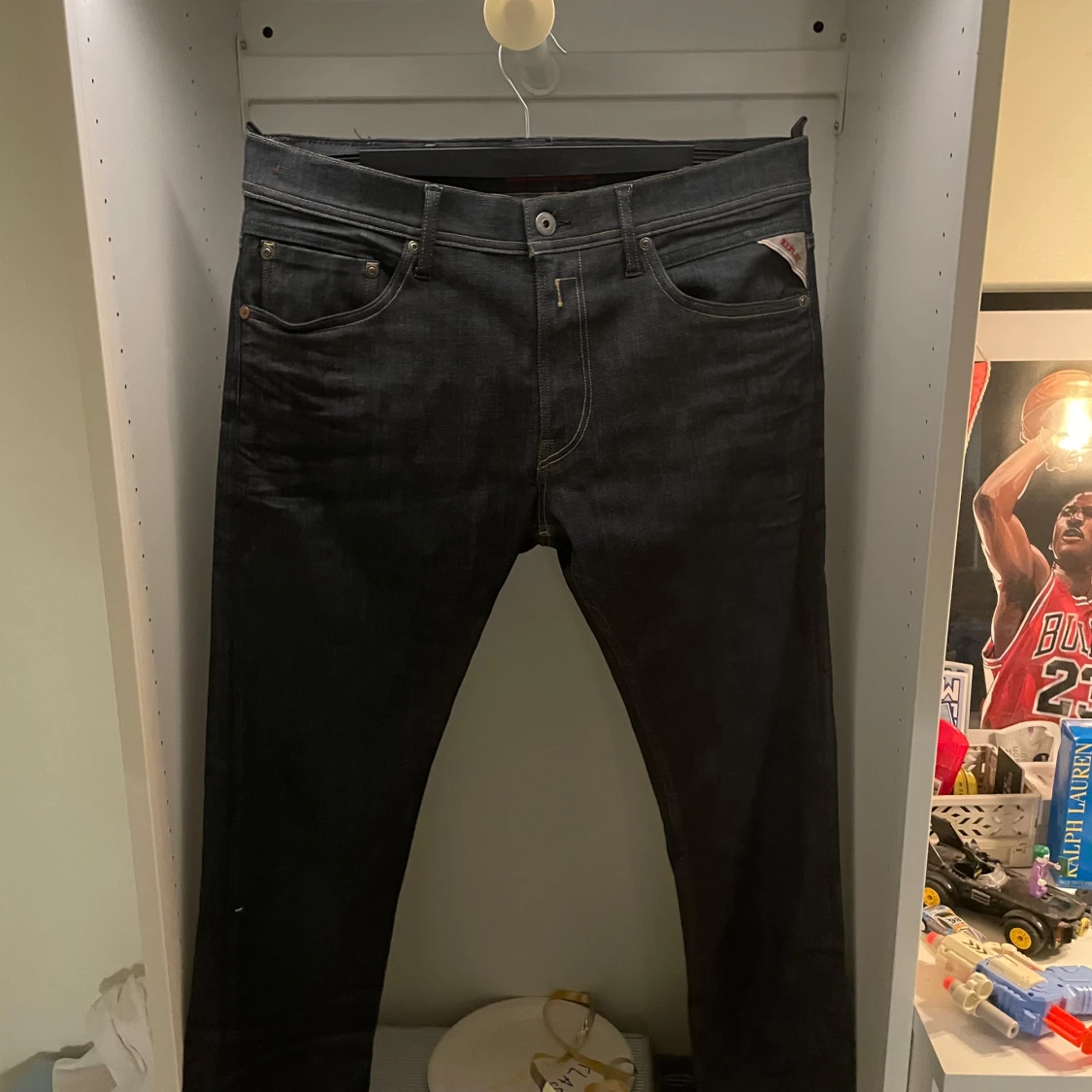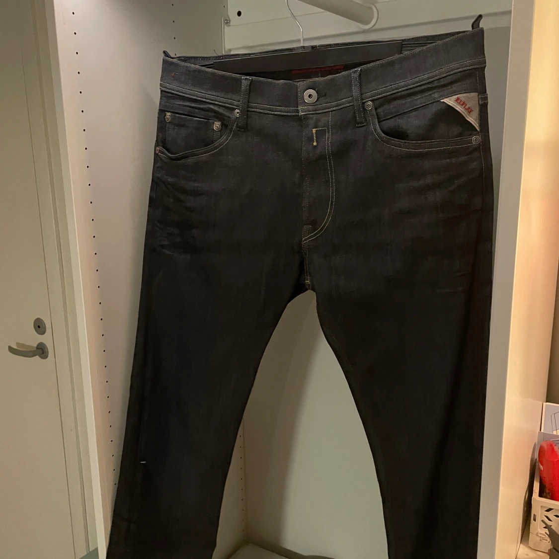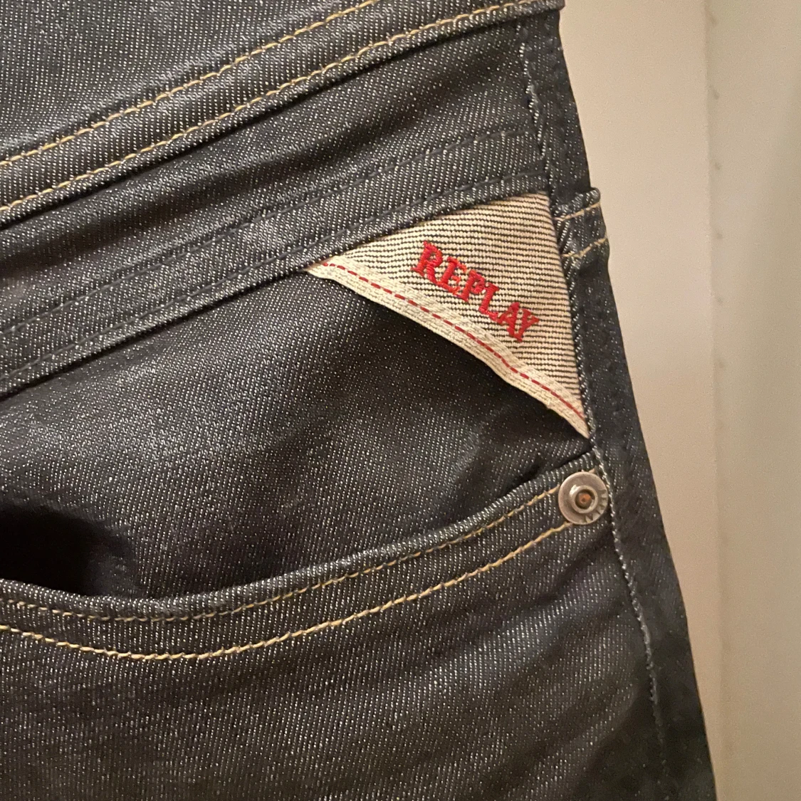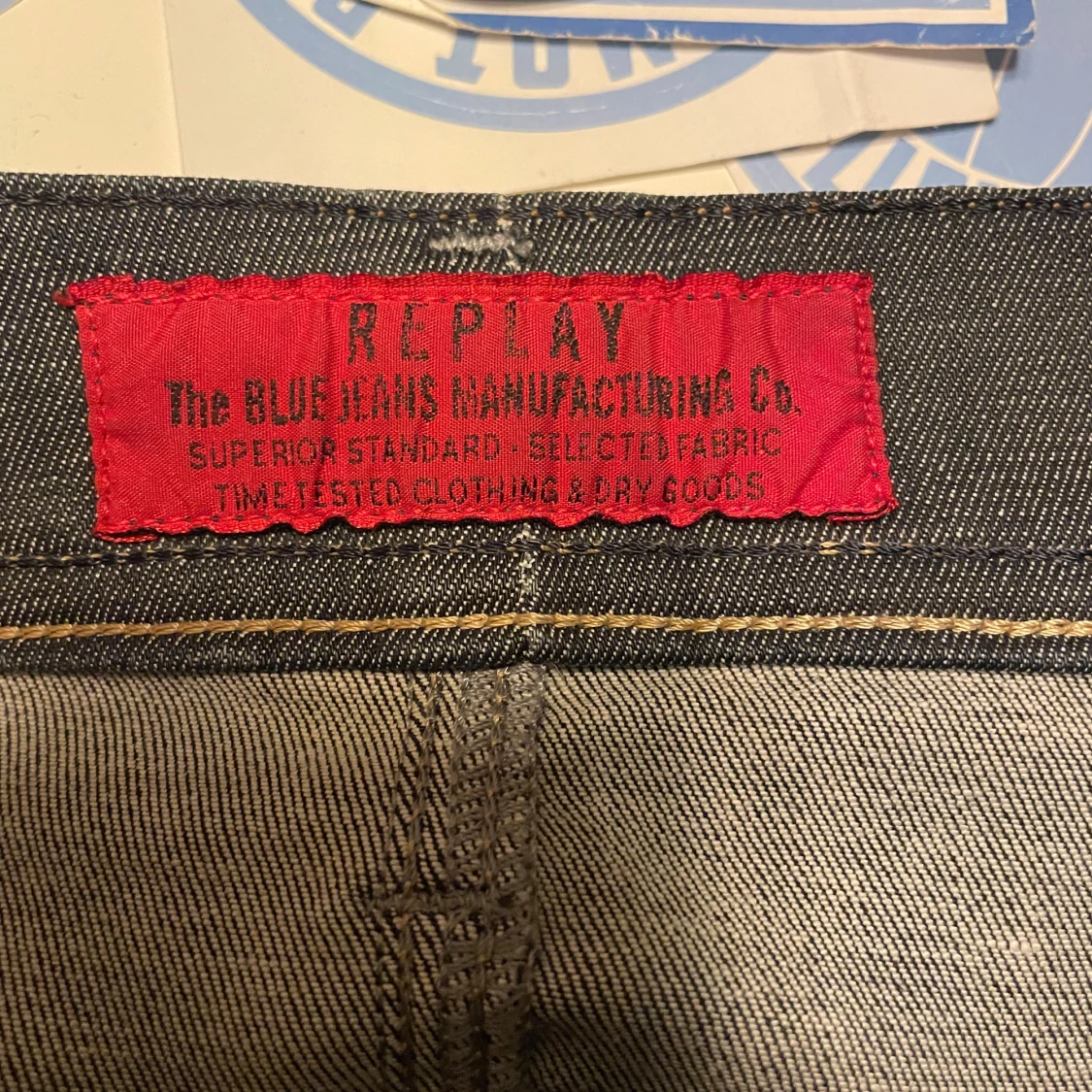 Snygga mörkblå jeans från Replay med klassisk femficksdesign och raka ben. Jeansen har tydliga Replay-detaljer vid fickan och röd etikett på insidan. Tillverkade i slitstarkt denimtyg med kontrastsömmar för en clean look. Aldrig använd. W33