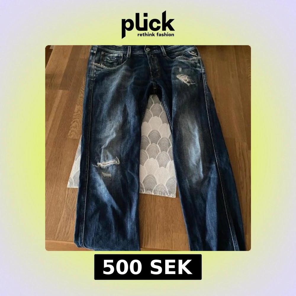 Säljer ett par snygga blå jeans från Replay. De har en cool slitning på framsidan och en klassisk femficksdesign. Jeansen är i en straight passform och har en knappgylf. Perfekta för en avslappnad stil!