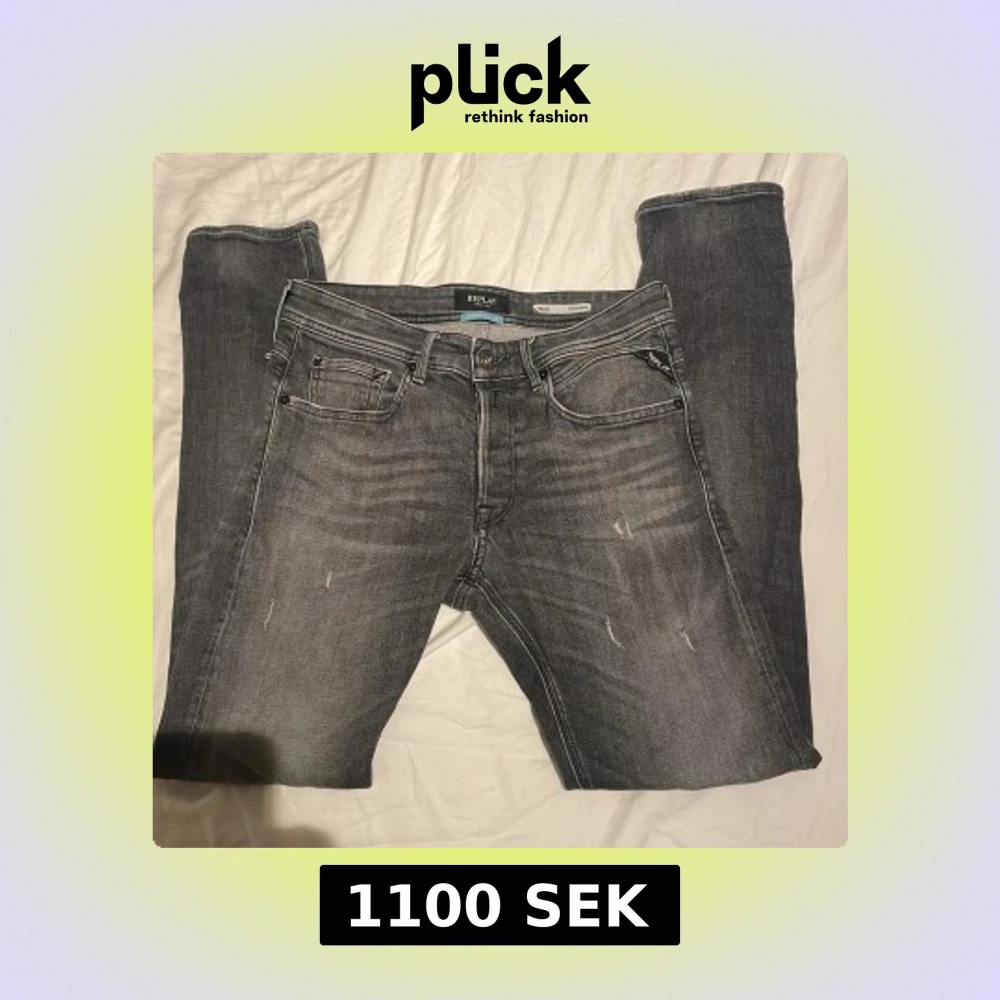 Snygga grå jeans från Replay, modell Willbi Regular Slim Fit. Jeansen har en tvättad look med diskreta slitningar och klassiska fem fickor. De är tillverkade i stretchigt jeanstyg och har svarta detaljer samt Replay-logga på bakfickan. . Helt oanvända och sitter riktigt bra!🌟🤩
