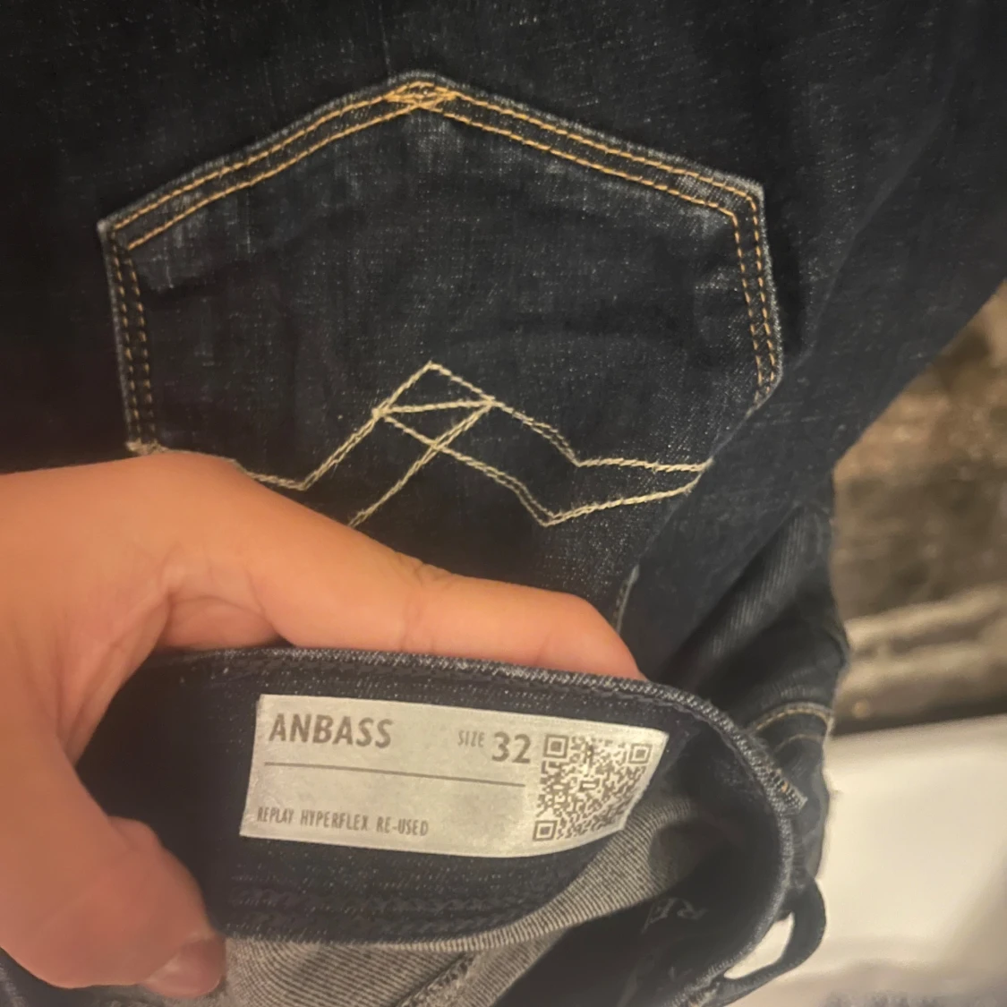 Replay jeans, har en lagning i skrevet men inget som syns när man använder dom