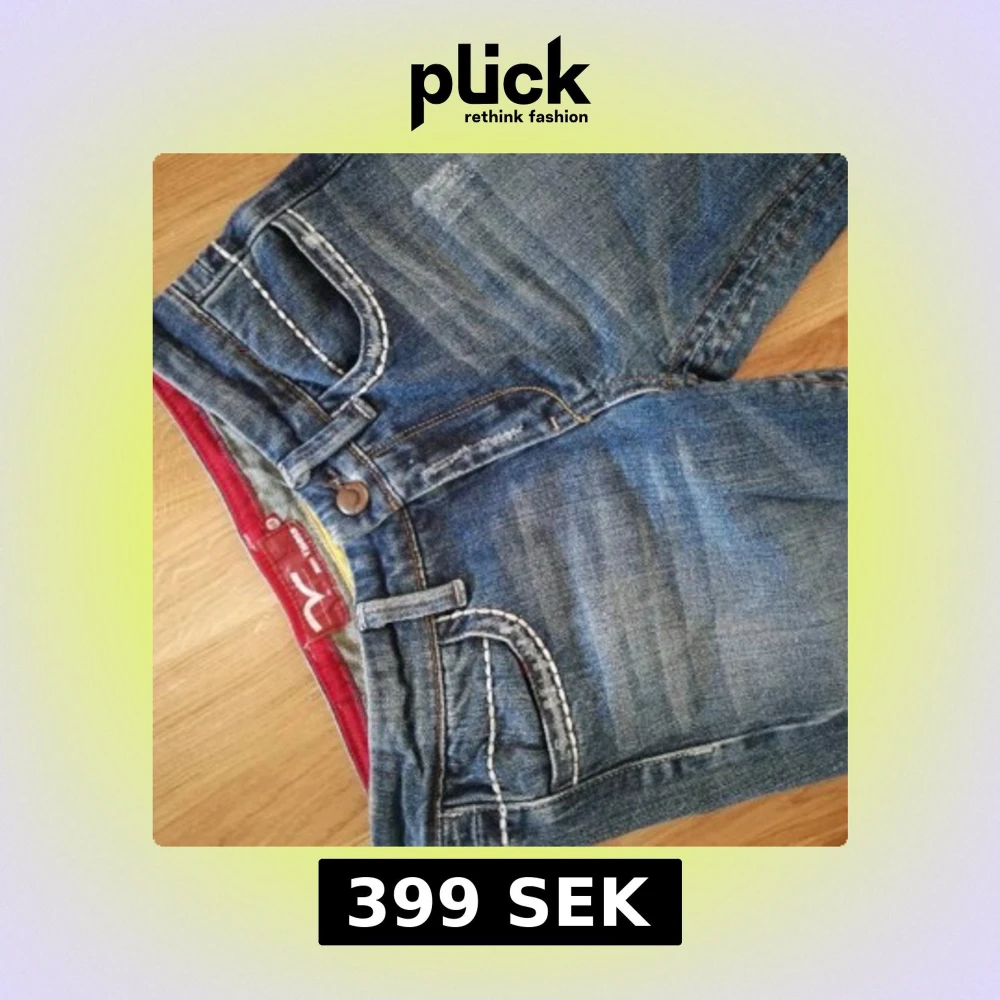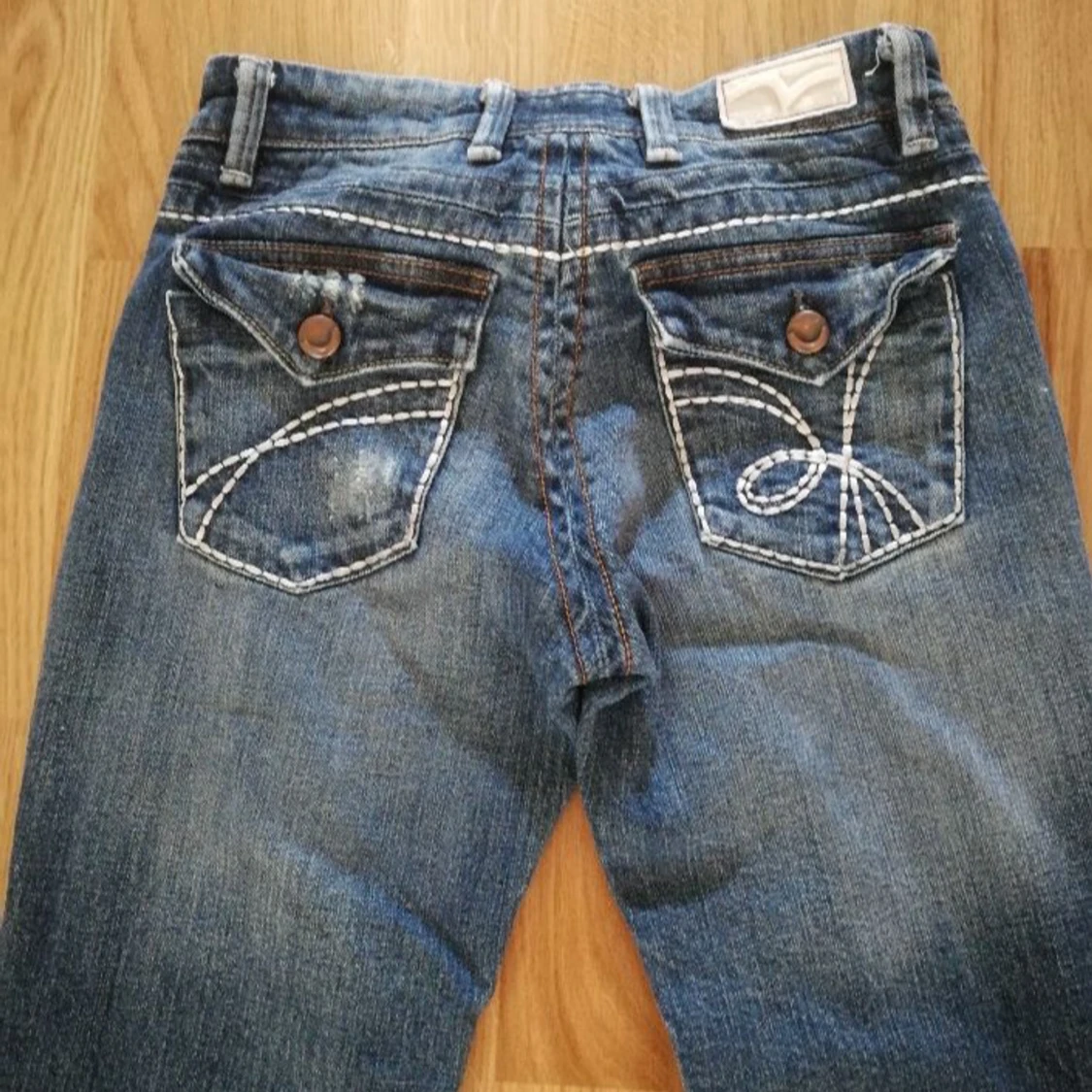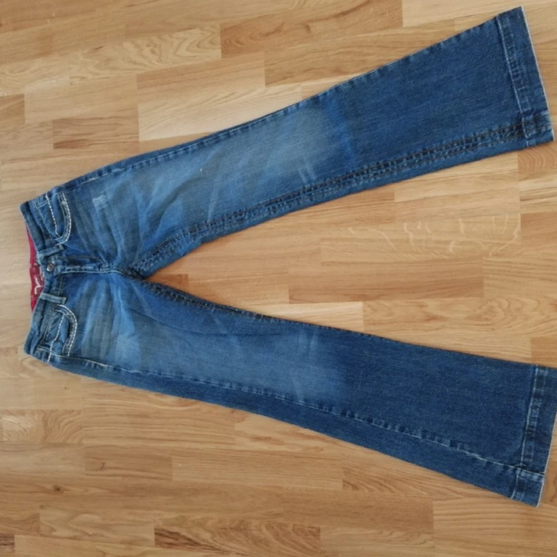 Snygga blå jeans från Replay med bootcut-modell och markerade vita kontrastsömmar. Jeansen har coola detaljer på bakfickorna och en röd insida i midjan. Klassisk femficksdesign. Säljer då de är lite stora på mig💕