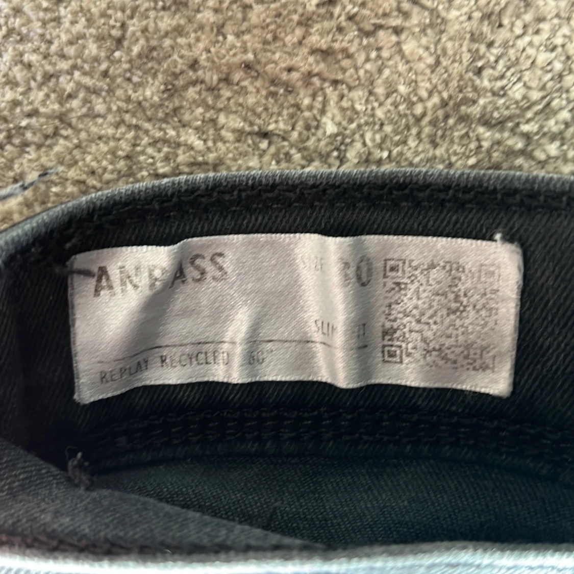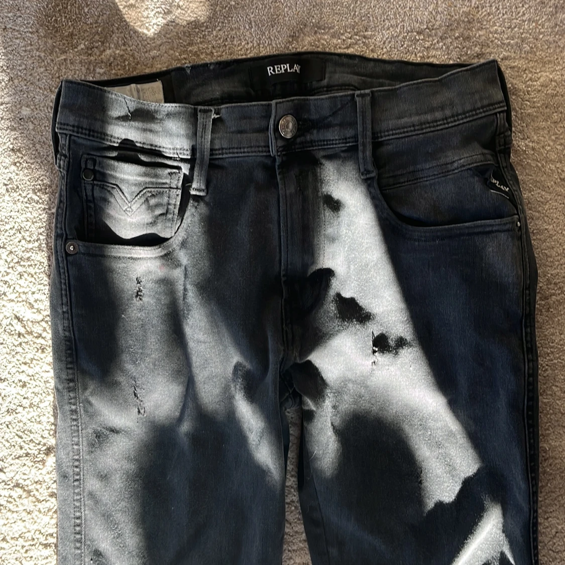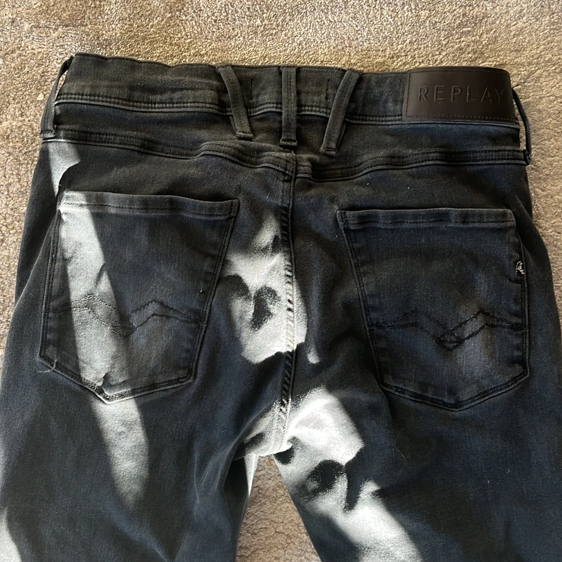 Snygga svarta Replay Anbass jeans med en cool, sliten look. De har en slim passform och är tillverkade i återvunnet material. Perfekta för en trendig stil.