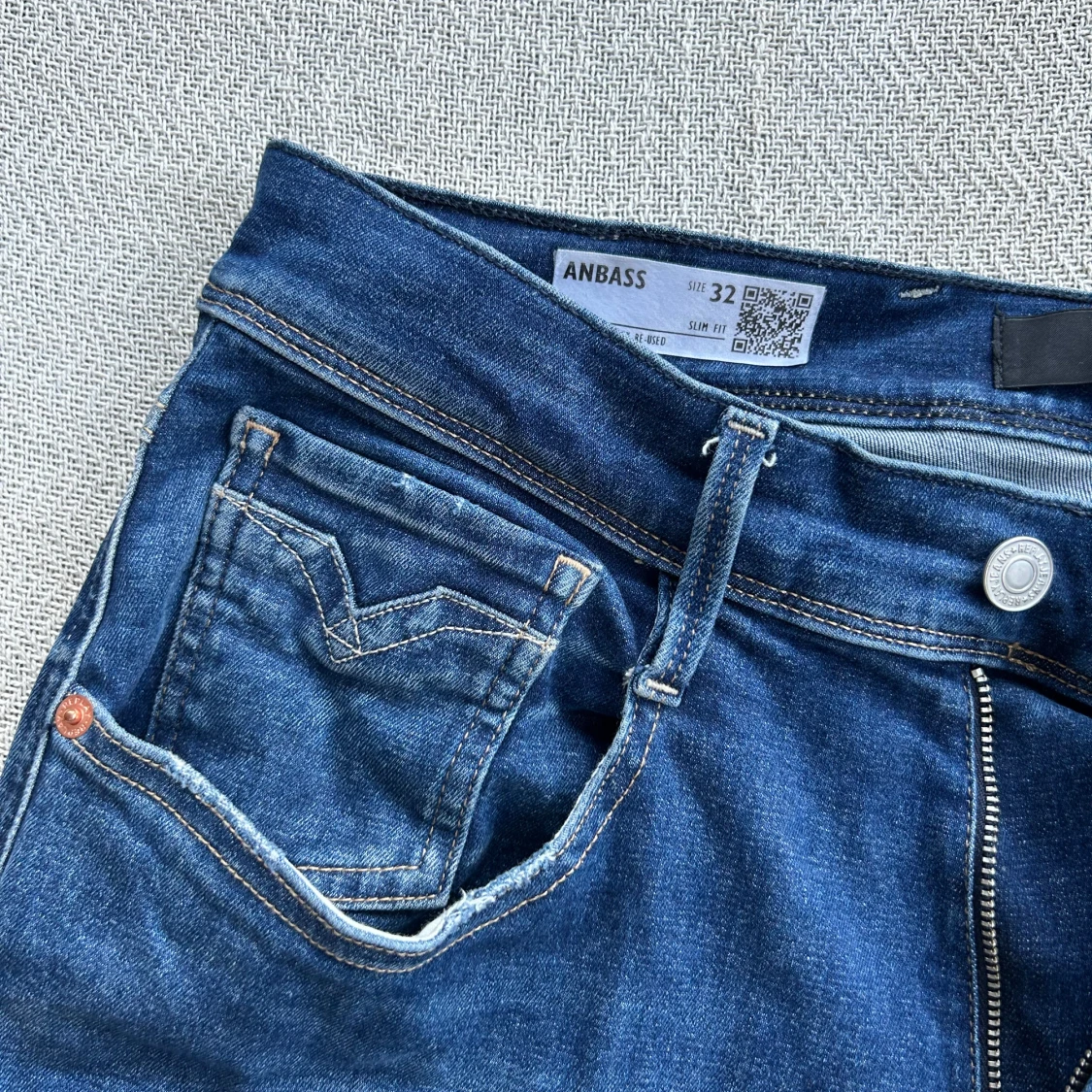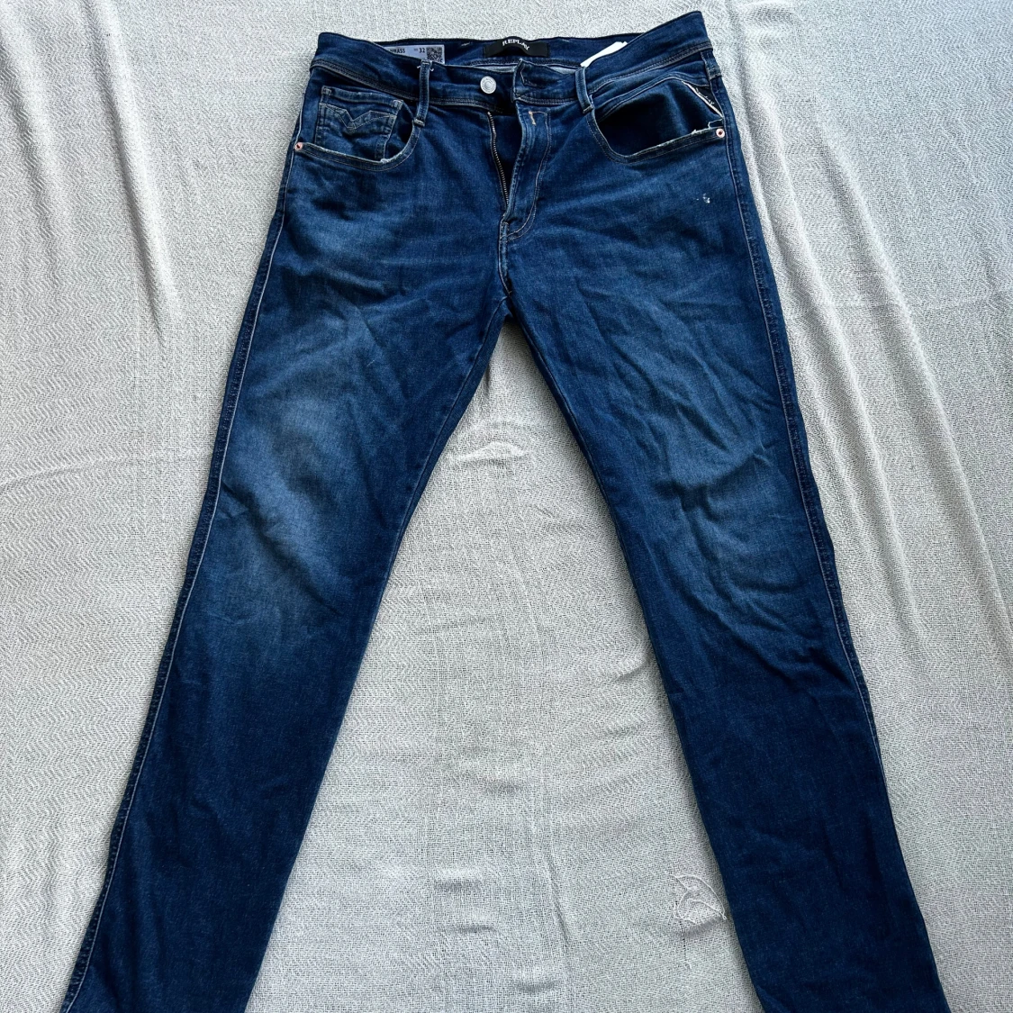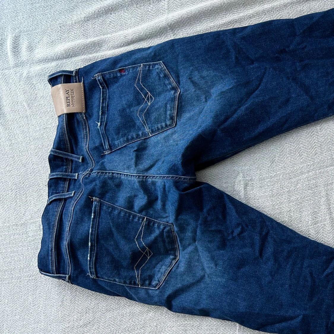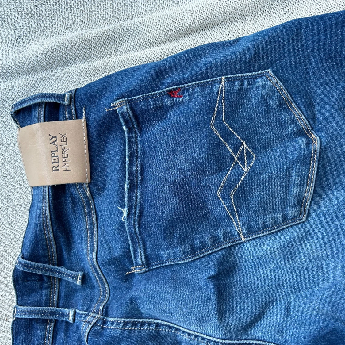 Snygga Replay Hyperflex Anbass jeans i mörkblå tvätt med klassiska fem fickor och kontrastsömmar. Rak modell med stretchigt material som ger en skön passform. Märkespatch bak i midjan och diskret broderi på bakfickan.
