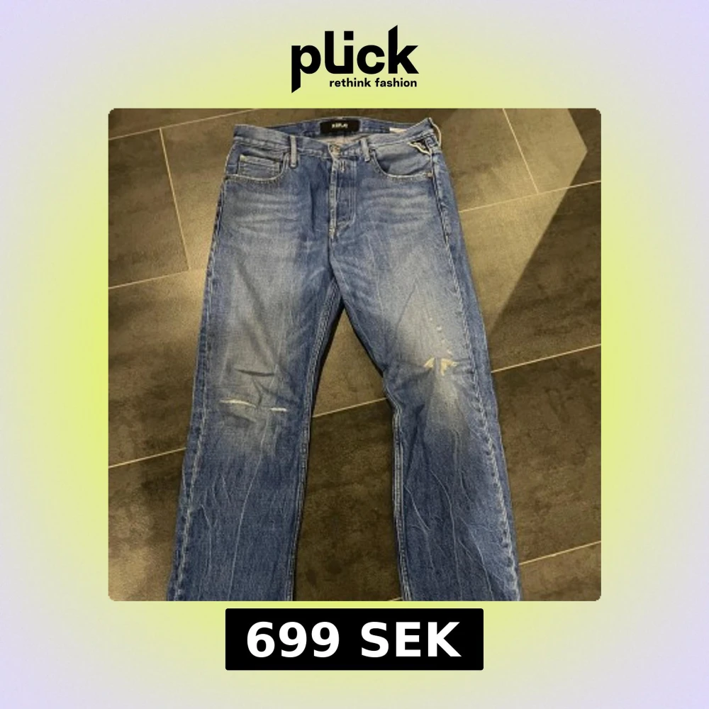 Säljer ett par klassiska blå jeans från Replay med raka ben och diskreta slitningar framtill. Byxorna har fem fickor, knappgylf och detaljerad Replay-logga vid fickan. Perfekta för en avslappnad stil.