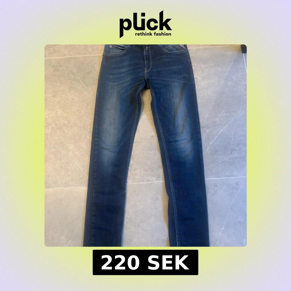 Säljer ett par Replay Hyperflex jeans i mörkblå tvätt med snygga slitningar. Jeansen har klassisk femficksdesign, raka ben och är tillverkade i stretchigt jeansmaterial för extra komfort. Perfekta för dig som vill ha både stil och rörelsefrihet.