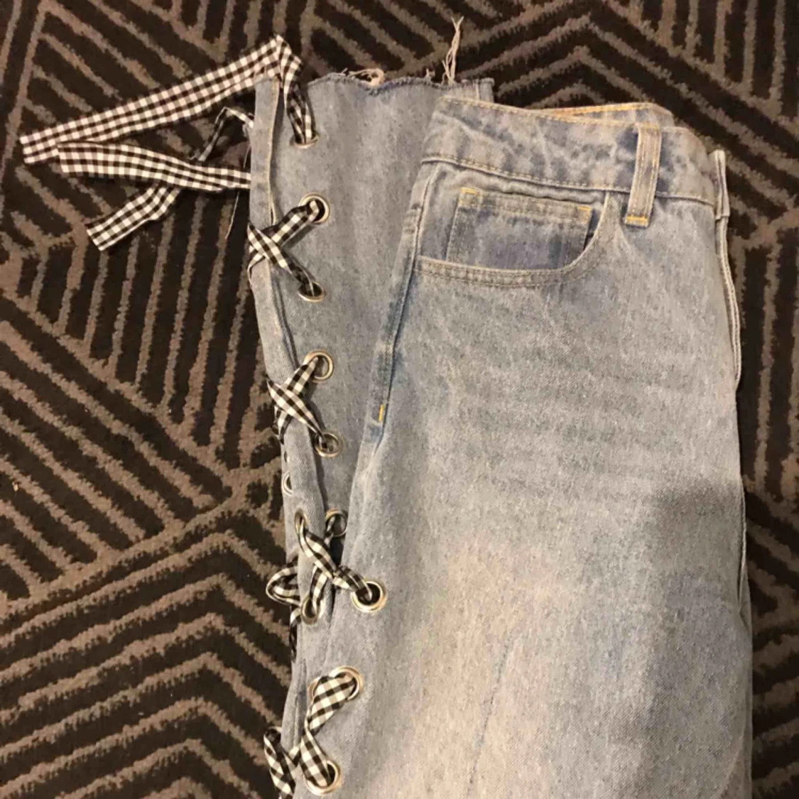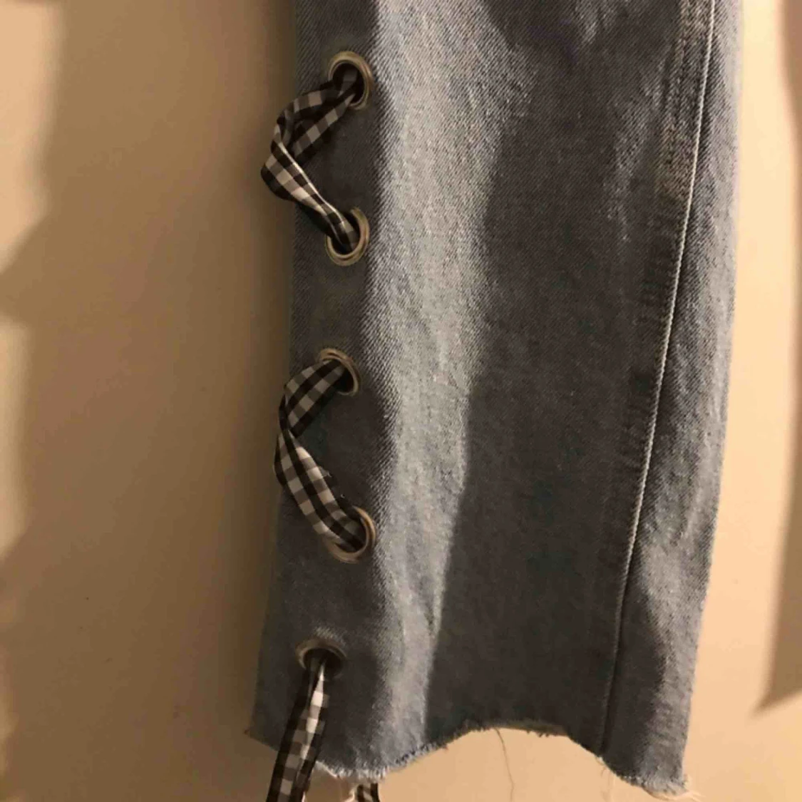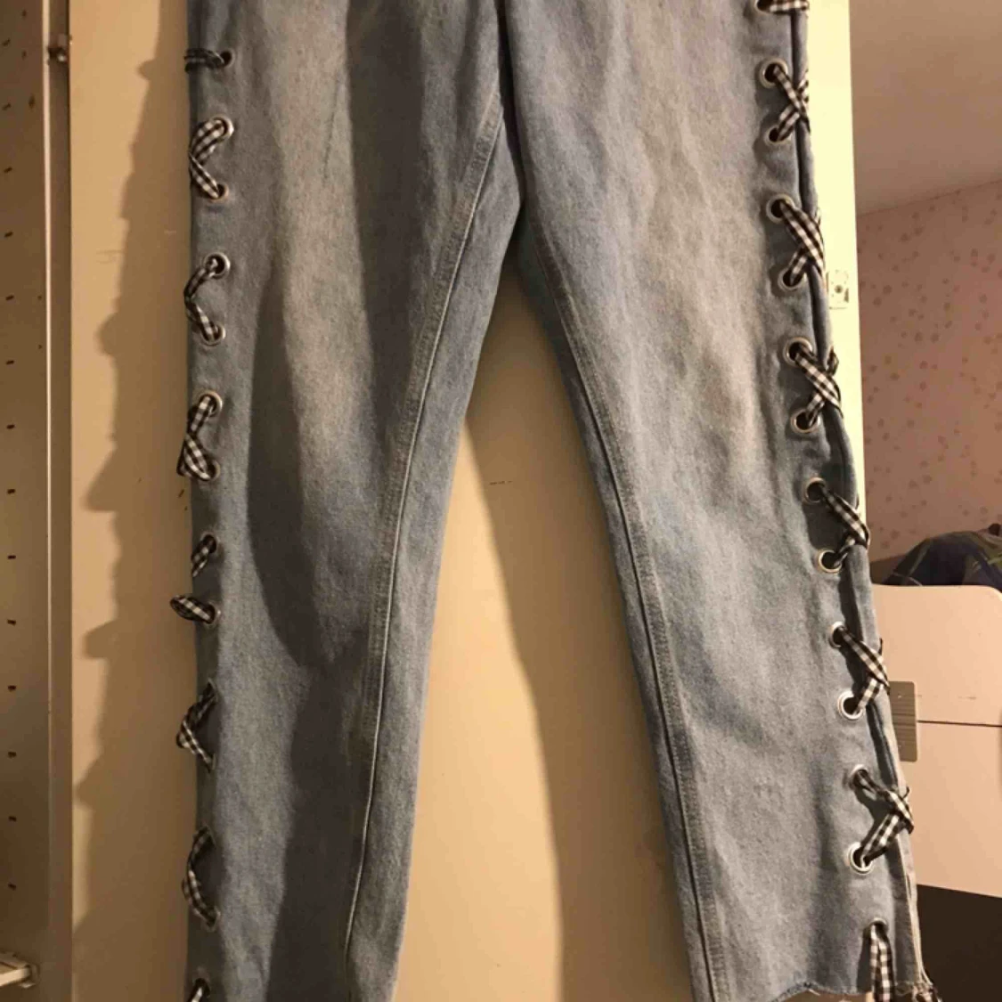 Storlek: 10/M Blåa jeans med detalj som jag köpt men inte kunnat ta på mig för att de var för småa. De är väldigt fina och passar att ta på sig på sommaren eller våren. Bor i gävle så kan mötas upp annars står köparen för frakt