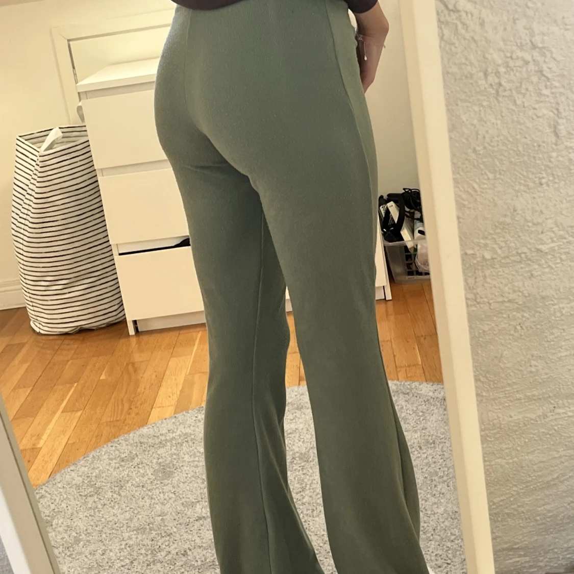 Jättefina utsvängda gröna byxor från urban outfitters. Man kan justera de i midjag så de blir låga eller mindre låga i midjan. Lite noppriga men de går att fixa med noppmasskin💚Storlek S, ganska långa.