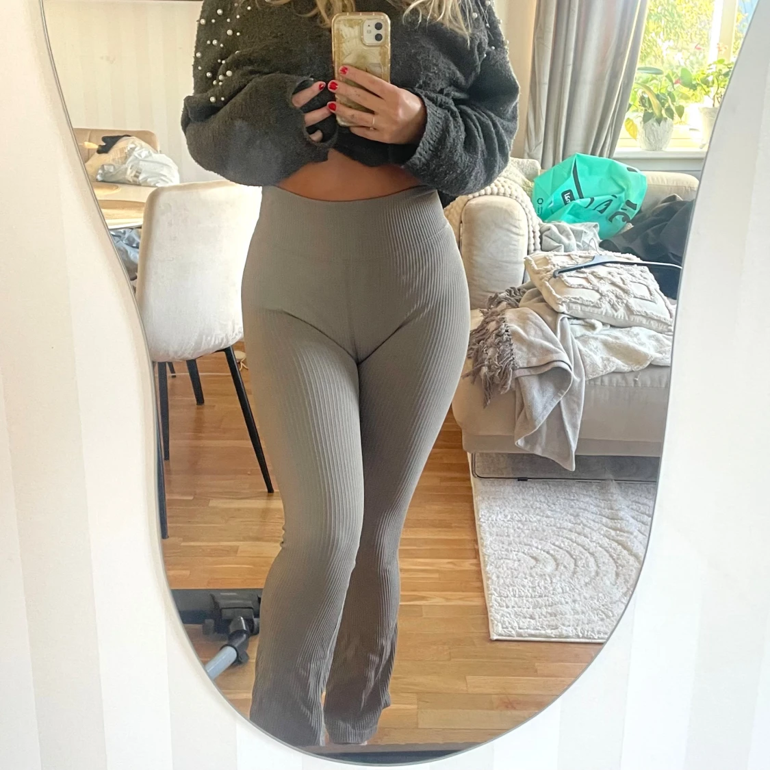 Supersnygga ribbade leggings i ljusgrått med bootcut och hög midja. Stretchigt material som sitter tajt över höfterna och låren och släpper ut vid anklarna. Från Lager 157, storlek M