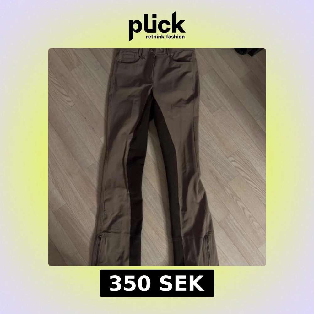 Helt oanvända snygga bruna ridbyxor med dragkedja vid bensluten och dubbla knappar i midjan. Byxorna har förstärkningar i mörkare ton på insidan av benen och praktiska fickor både fram och bak💕