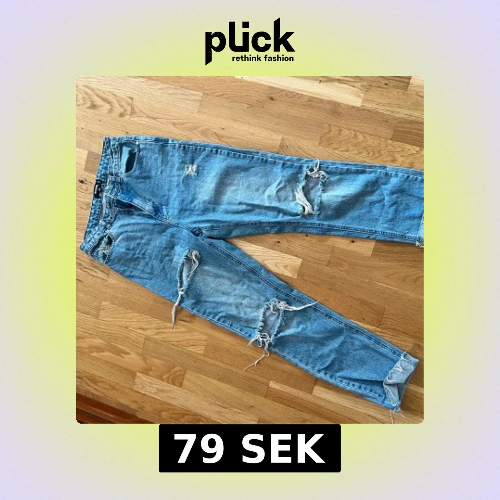 Säljer ett par blå jeans från Missguided med flera slitningar och hål framtill. Jeansen har klassisk femficksdesign, normal passform och raka ben.