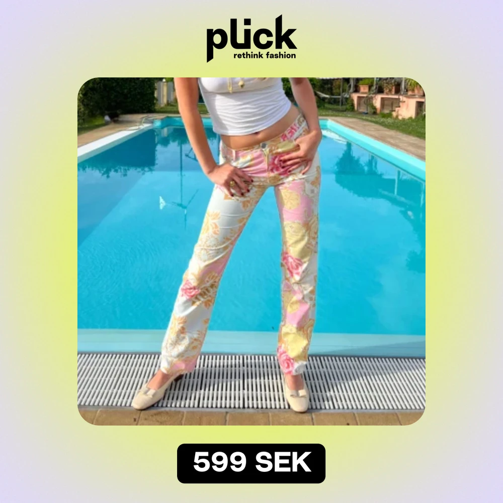 Our iconic Roberto Cavalli trousers in a beautiful flower pattern đș Pair with a fitted t-shirt and some cute kitten heels for the perfect evening look! waist: 38cm length: 108cm inseam: 82 cm