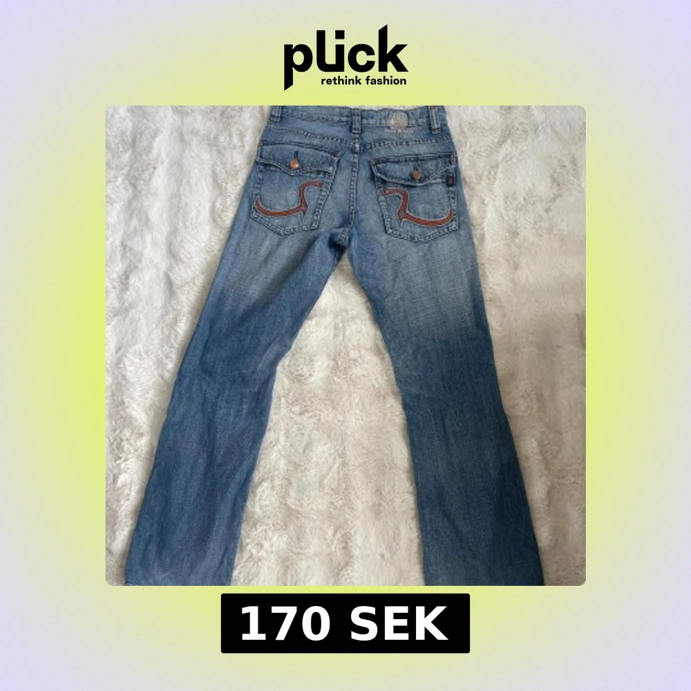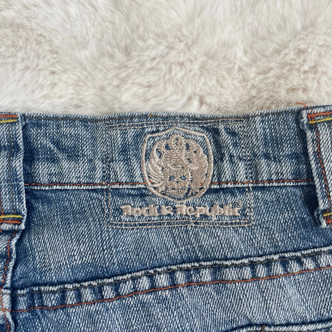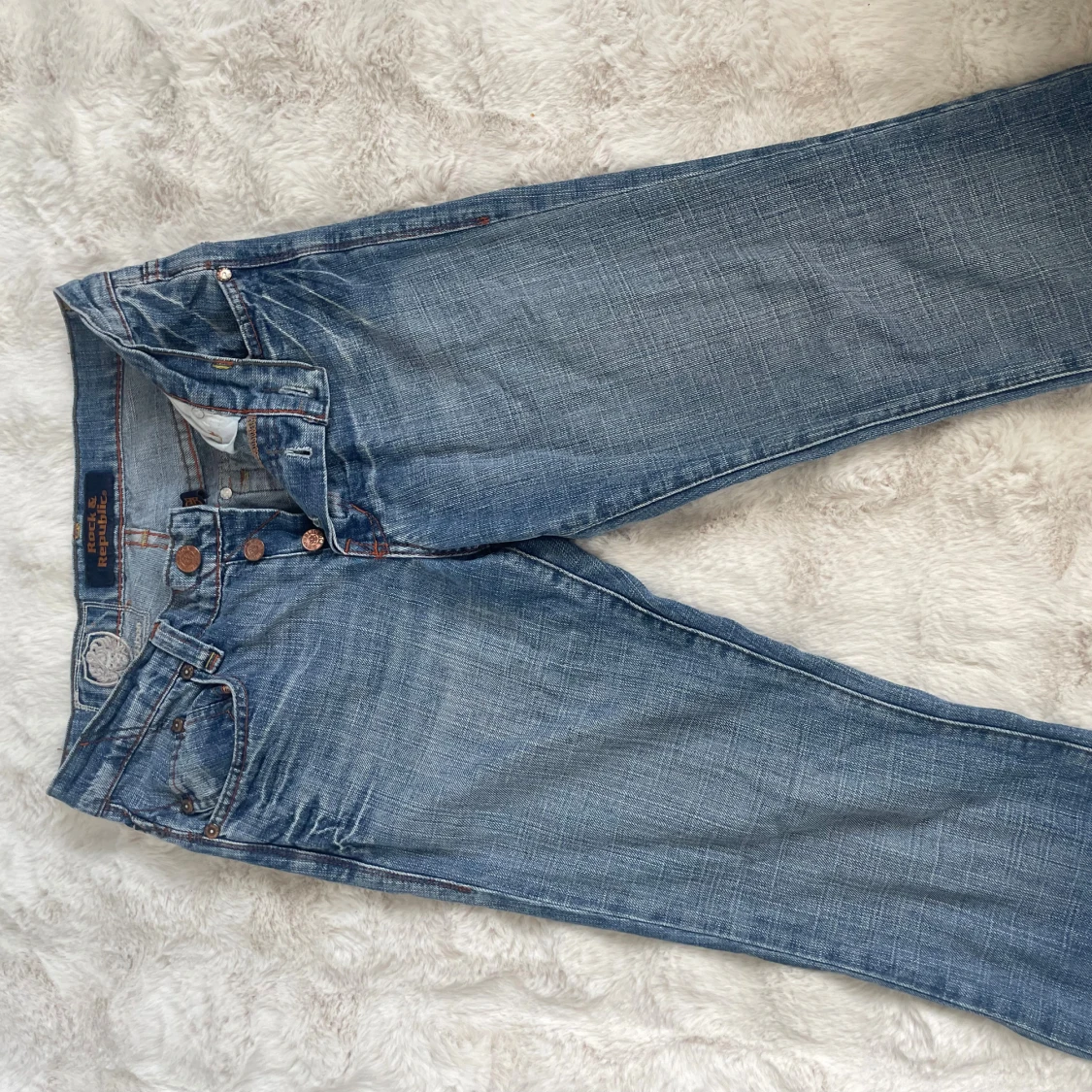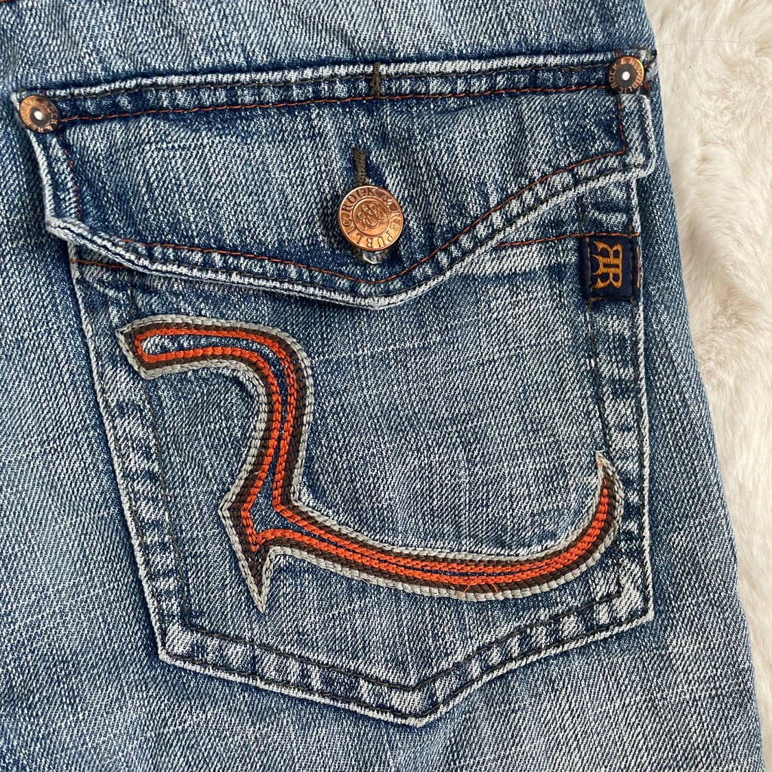 Blå jeans från Rock & Republic med snygg broderad detalj i orange och grått på bakfickorna. Jeansen har raka ben, slitna kanter nertill och klassiska kopparfärgade knappar. Materialet är robust denim med cool tvättad look.