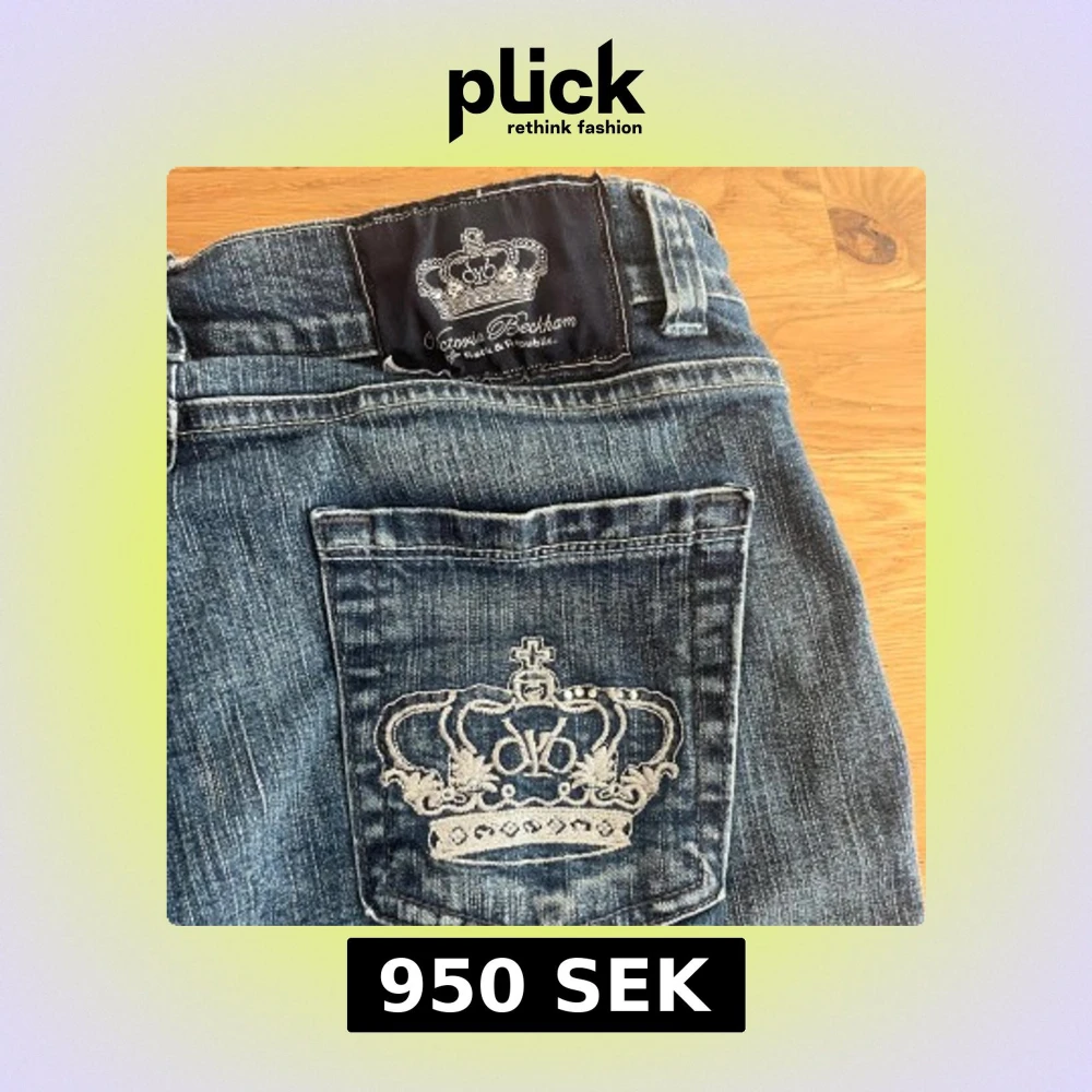 Snygga blå jeans från Rock & Republic i samarbete med Victoria Beckham. Modellen har raka ben och coola broderade kronmotiv på bakfickorna. Klassisk femficksdesign, silverfärgade detaljer och slitningar för en trendig look.