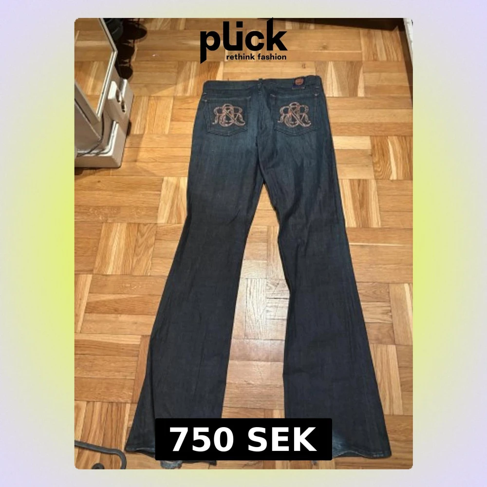 Mörkblå jeans från Rock & Republic med bootcut passform och snygga broderade bakfickor med glittriga detaljer. Klassisk femficksmodell med kopparfärgade nitar och knappar. Jeansen är gjorda i jeansmaterial och har en cool, lite utsvängd siluett.