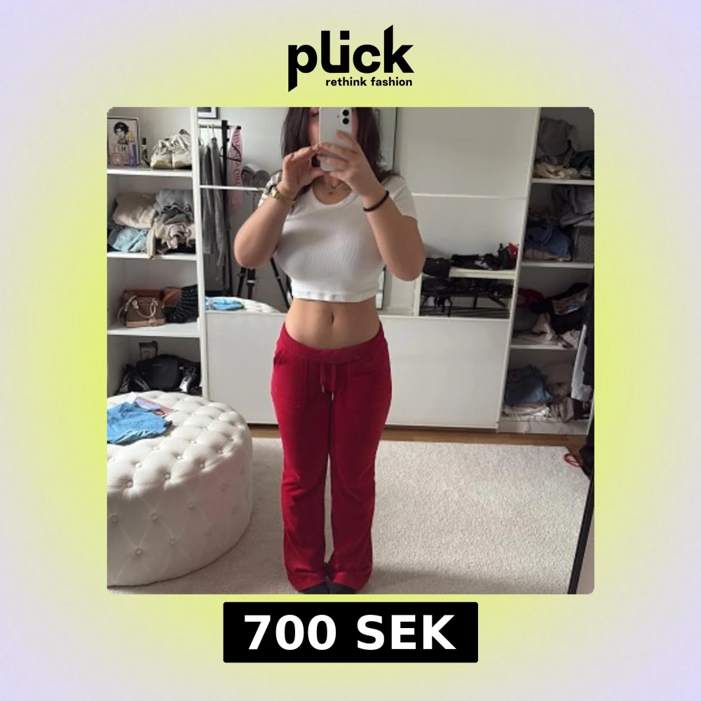 Säljer ett par klassiska röda mjukisbyxor från Juicy Couture med dragsko i midjan och fickor bak med knappdetalj. Helt nytt skick, knappt använda. Jag har matchande zip hoodien om man är intresserad i att ha ett sett, öppen för att sälja den tillsammans med byxorna. Pris kan diskuteras ❣️