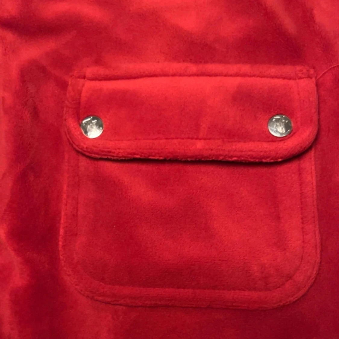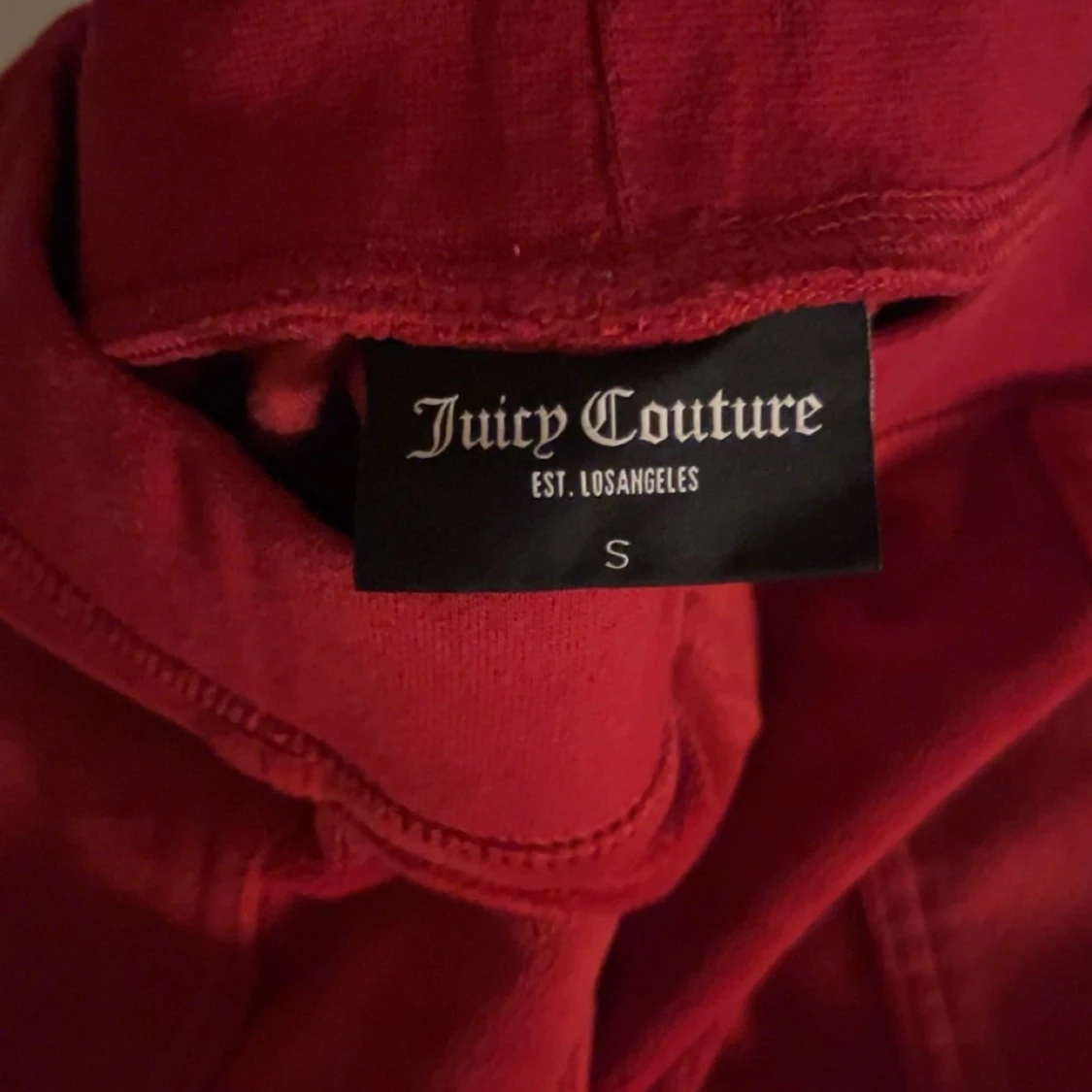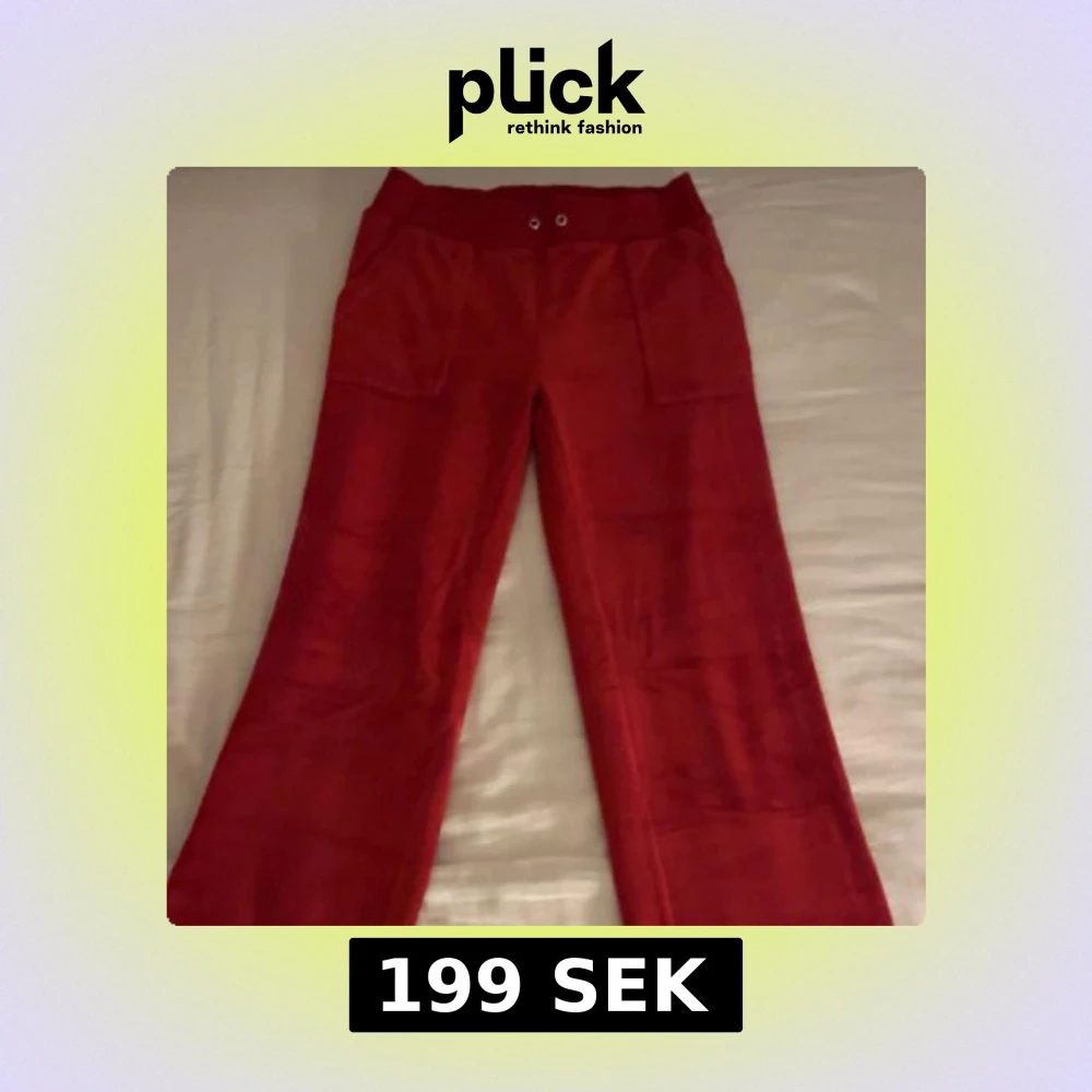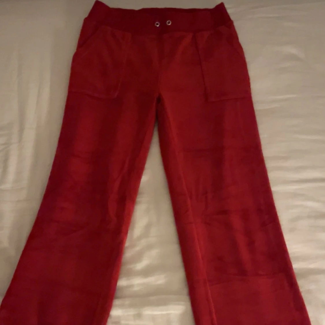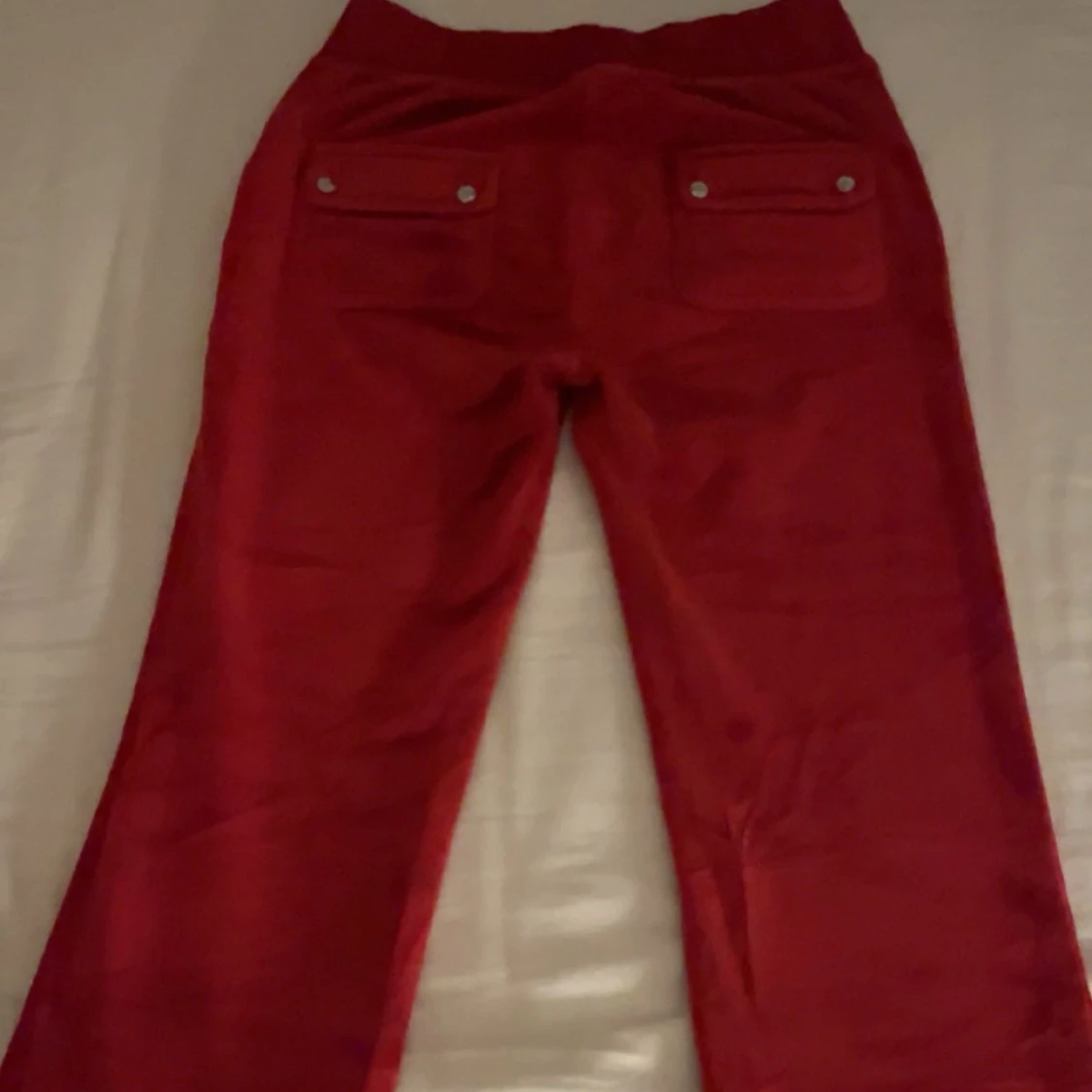 Snygga röda byxor från Juicy Couture med fickor och knappar bak. Byxorna har en loose passform och är tillverkade i ett mjukt material som ger en bekväm känsla. Perfekta för en avslappnad stil. Tyvärr så har snörena åkt ur och gick inte att få tillbaka men annars är byxorna helt fria från defekter och är endast använda ett fåtal gånger❤️