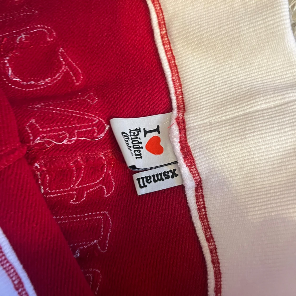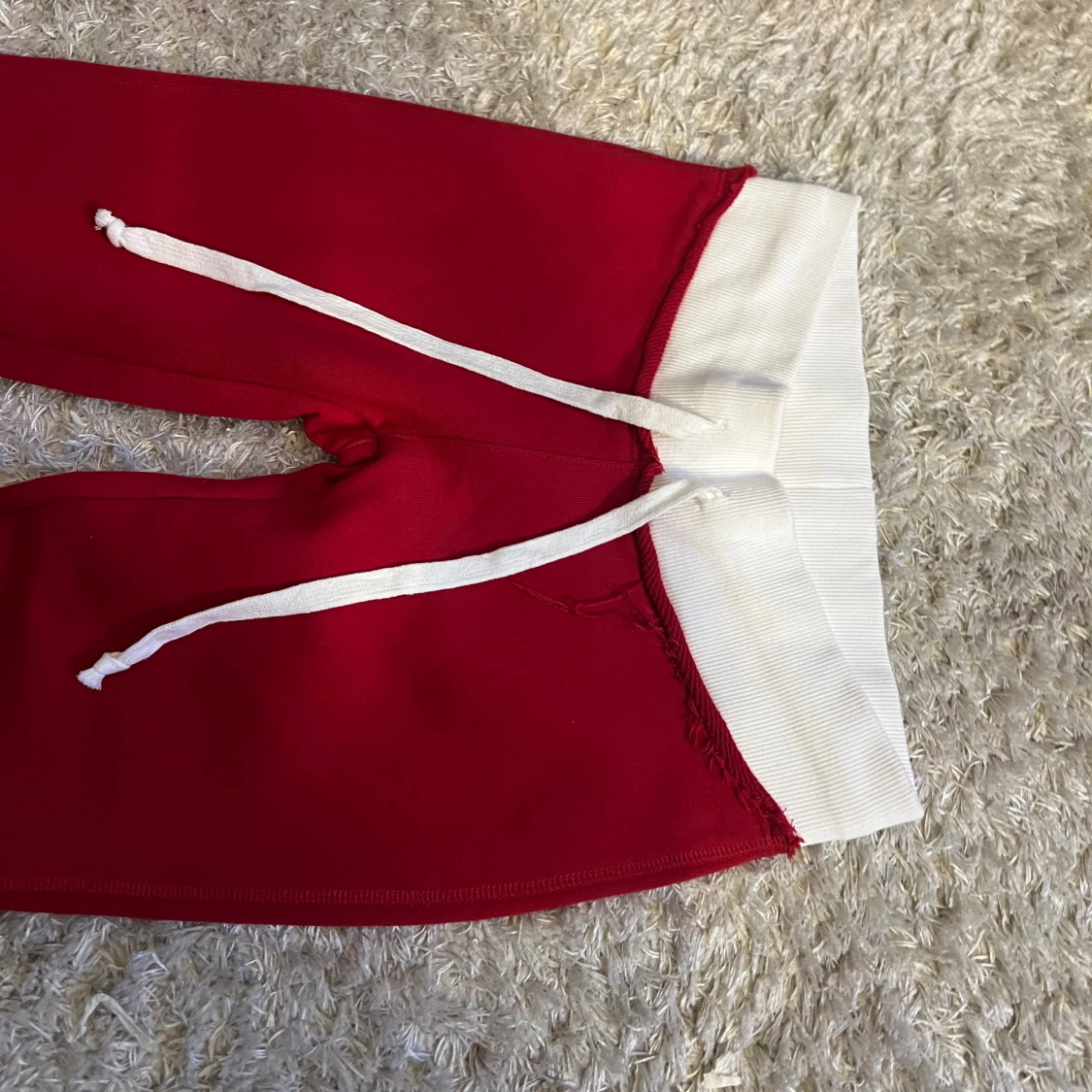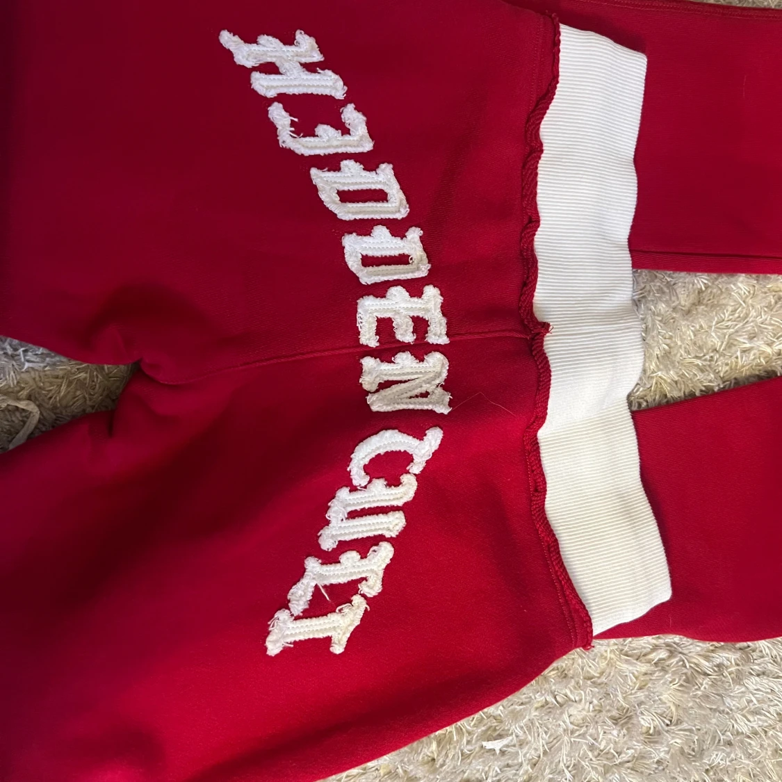 Röda mjukisbyxor från Hidden Cult med vit ribbad midja och snörning. Bootcut-modell med broderad vit logga bak. Sköna och snygga byxor i mjukt material, perfekta för en chill och trendig look.