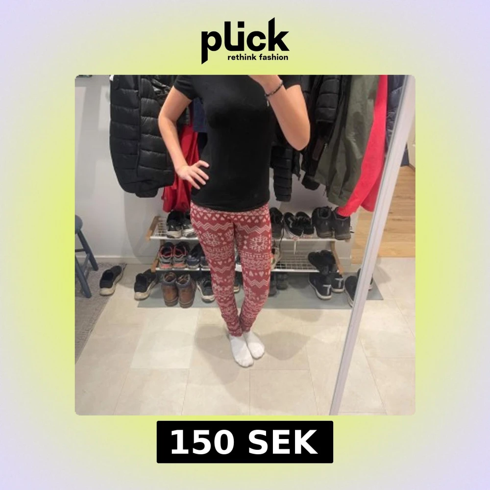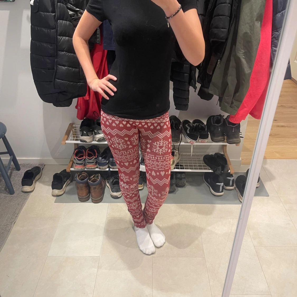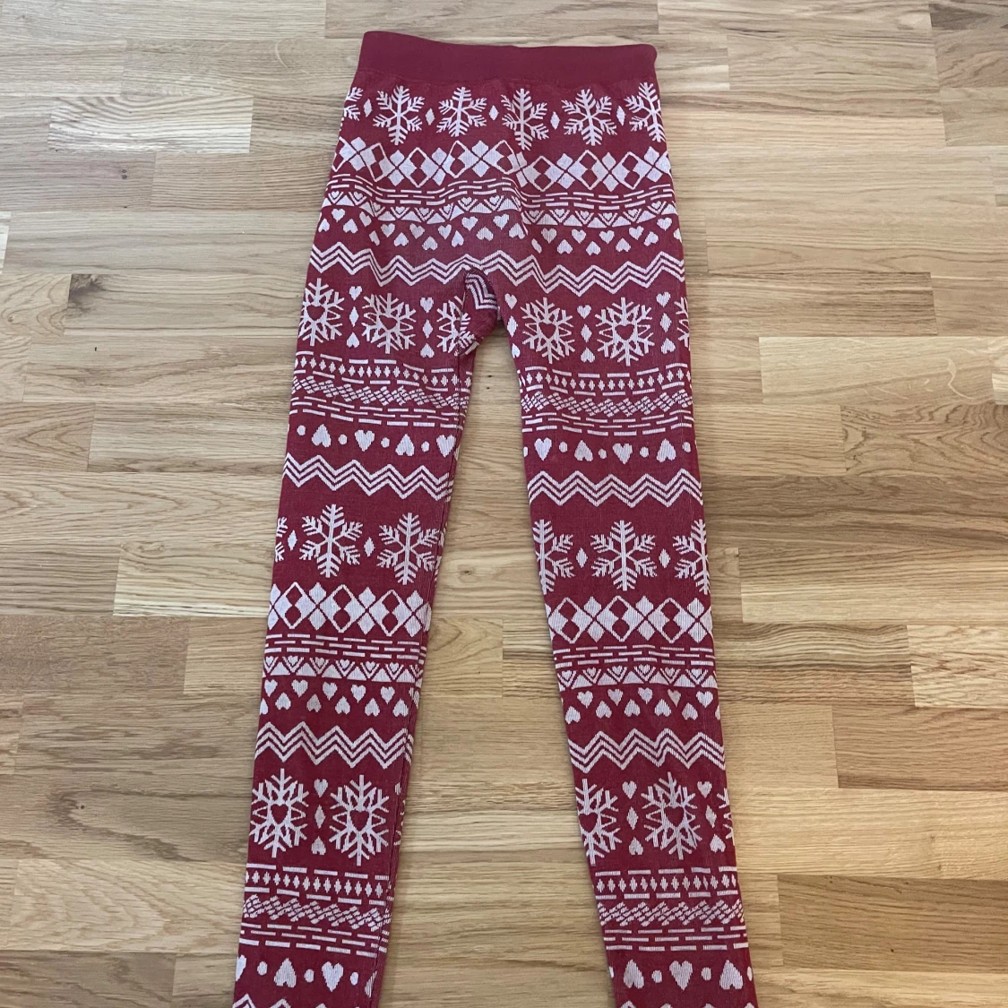 Röda leggings med hjärtan och zigzag-mönster. Stretchigt material som sitter tight och är perfekta för mysiga kalla dagar. mjuk känsla, passar dig som vill ha något bekvämt och snyggt till vintern. Storleken är mellan S-XS