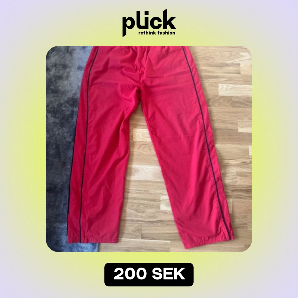 Säljer ett par röda techbyxor! Byxorna är lösa och bekväma, perfekta för en avslappnad dag hemma eller lättare träning. -skick: 8.5/10 - ordinarie pris: 700 -pris kan diskuteras!