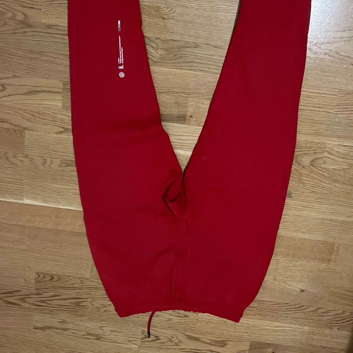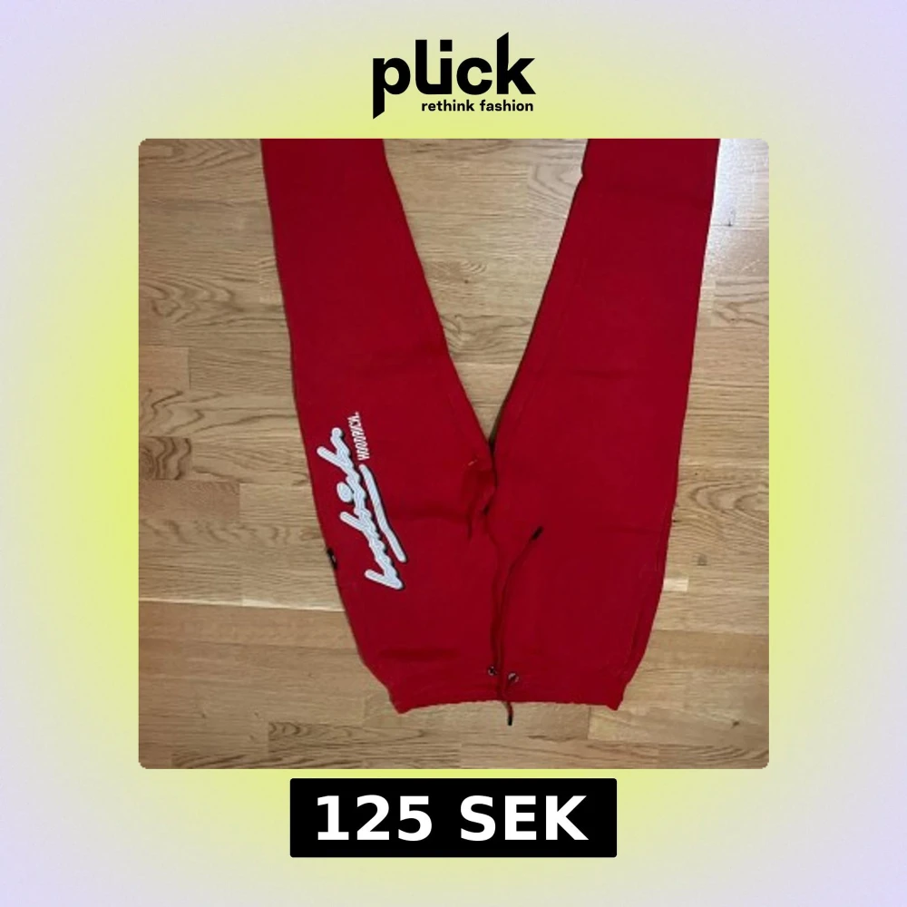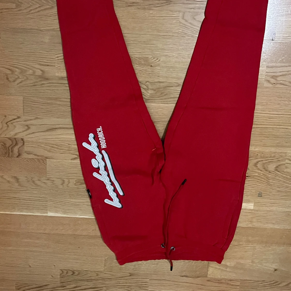 Röda mjukisbyxor med vit broderad logga och text på vänster ben. Byxorna har snörning i midjan och är tillverkade i mjukt material. Perfekta för en avslappnad stil.