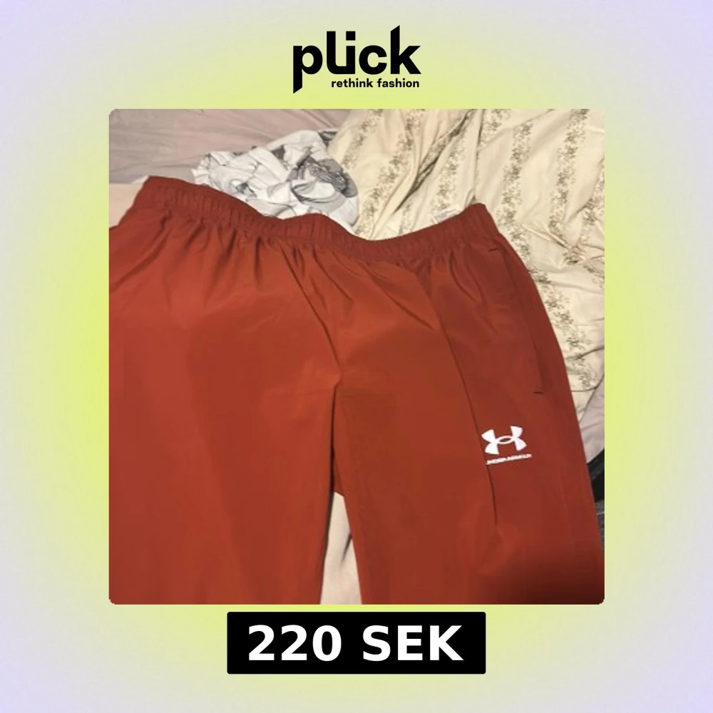 Säljer ett par röda träningsbyxor från Under Armour i storlek XL. Byxorna har resår i midjan och är tillverkade i ett lätt syntetmaterial, perfekta för träning. Klassisk logga på benet och enkel, sportig look.