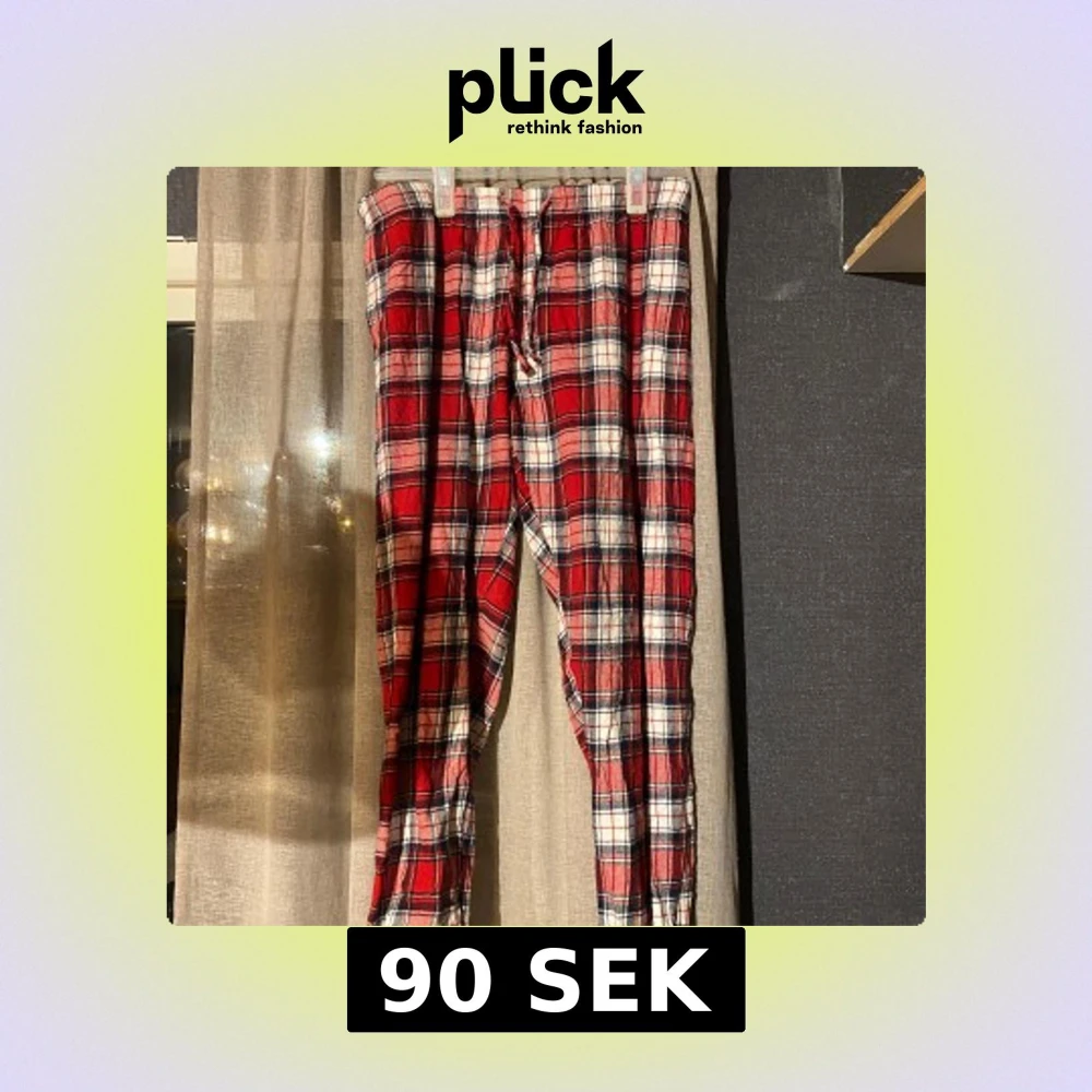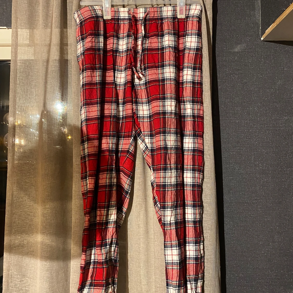 Rödrutiga mjukisbyxor i storlek L från C. Byxorna har klassiskt rutigt mönster i rött, vitt och marinblått, samt snörning i midjan för skön passform. Perfekta för chill dagar hemma eller när du vill vara extra bekväm.