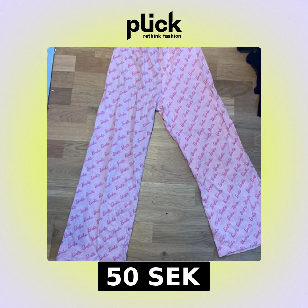 Säljer ett par rosa byxor med ett all-over Barbie-tryck. Byxorna har en loose passform och är perfekta för en avslappnad stil. De är elastiska i midjan för extra komfort.