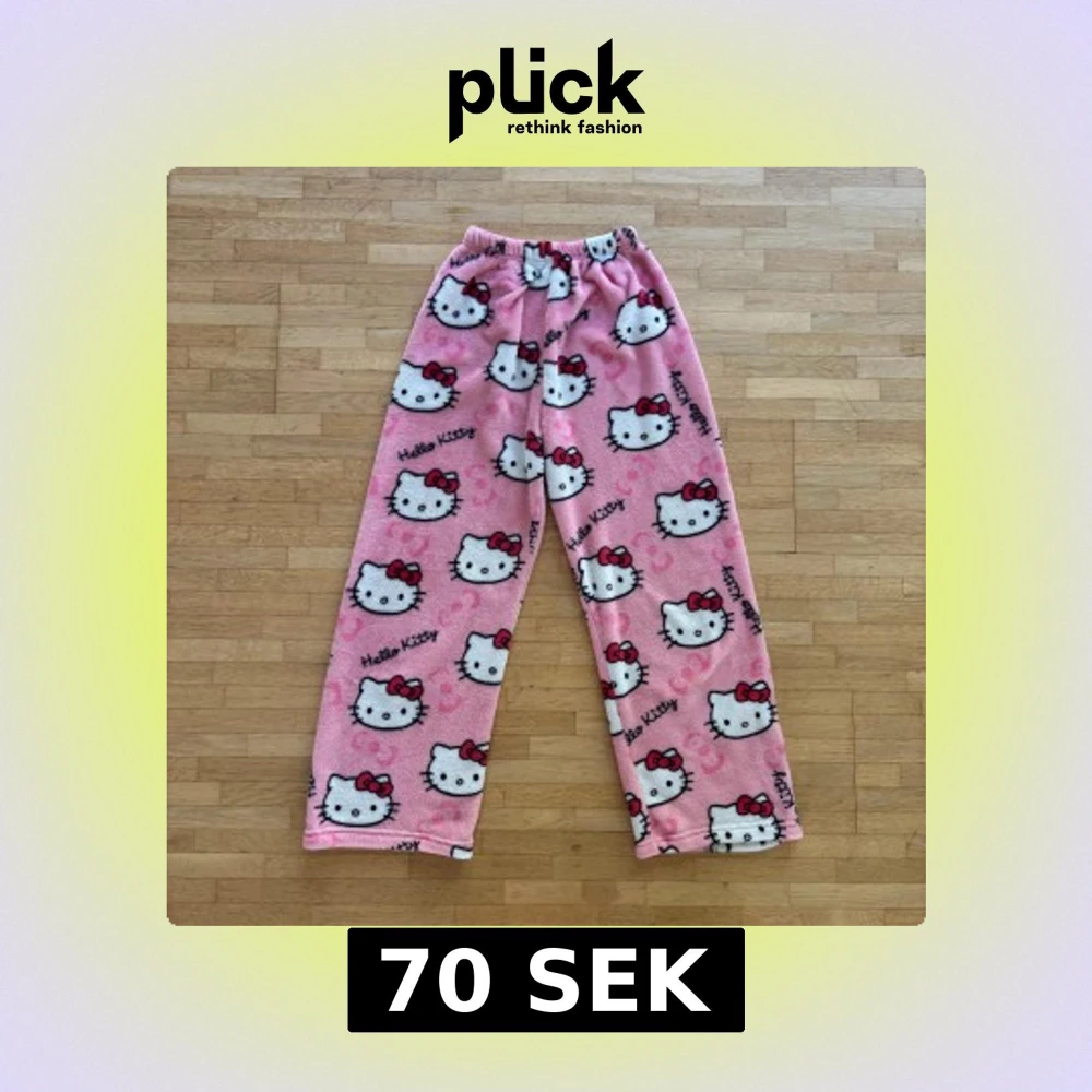 Supermysiga rosa fleecebyxor med Hello Kitty-tryck över hela byxan. De har elastisk midja och är löst sittande med raka ben. Perfekta för chill hemma eller sleepover med kompisar. Mönstret är gulligt med vita Hello Kitty-ansikten och röda rosetter. Ganska korta i benen så man får ha dem rätt så lågmidjat. Märke är okänt eftersom det inte var jag som köpte dem.