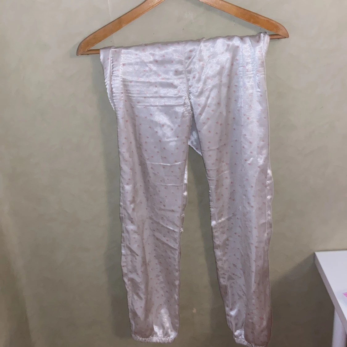 Jag säljer detta vita byxor med små rosa hjärtan på! Bra skick har bara använt några gånger! Stolek 152 funkar som Xxs