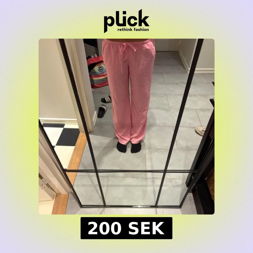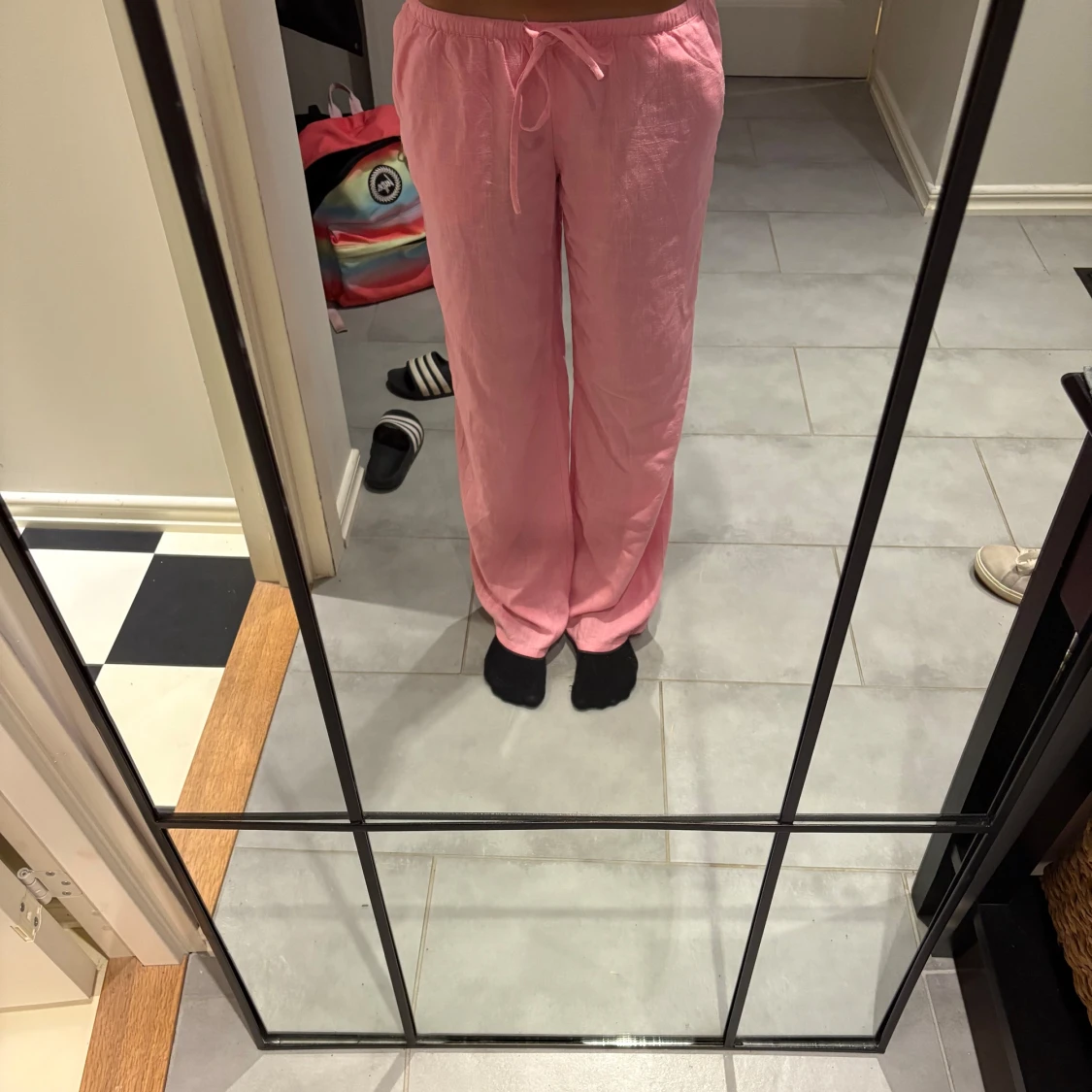 Säljer ett par ljusrosa linnebyxor med avslappnad passform och snörning i midjan. Byxorna har raka, vida ben och är perfekta för en chill och bekväm stil. Materialet är svalt och luftigt, vilket gör dem sköna att bära under varmare dagar.