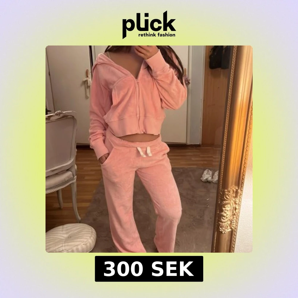 Supermysiga rosa mjukisbyxor i velour med dragsko i midjan och raka ben. Byxorna har en relaxed fit och är perfekta för chill dagar hemma. Matchande hoodie finns också om du vill köra hela setet. Original pris runt 1000 kr