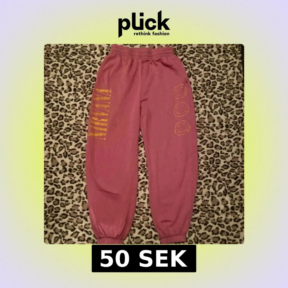 Säljer rosa mjukisbyxor med elastisk midja. Byxorna har ett gult Nirvana-tryck längs benet och tre smiley-ansikten. Perfekta för en avslappnad stil. Har små fläckar vid låren.