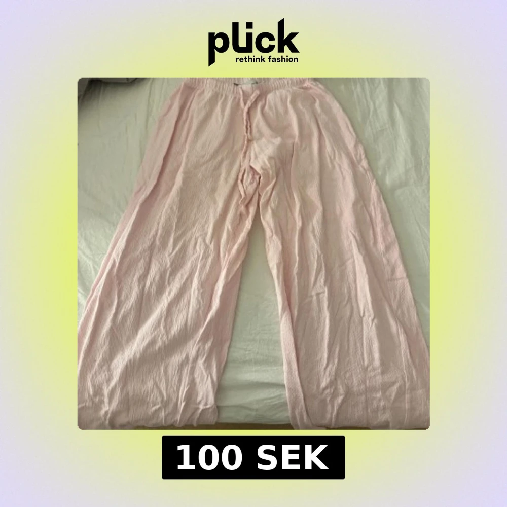 Säljer ett par rosa pyjamasbyxor. De har en loose passform och är perfekta för en avslappnad stil. Byxorna har en elastisk midja med snörning för extra komfort. Från Lager 157.