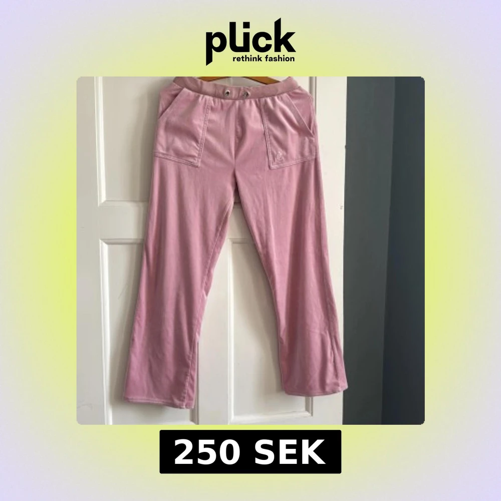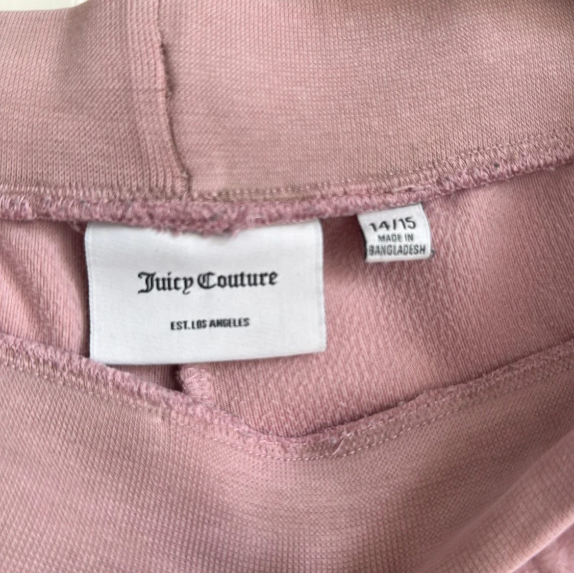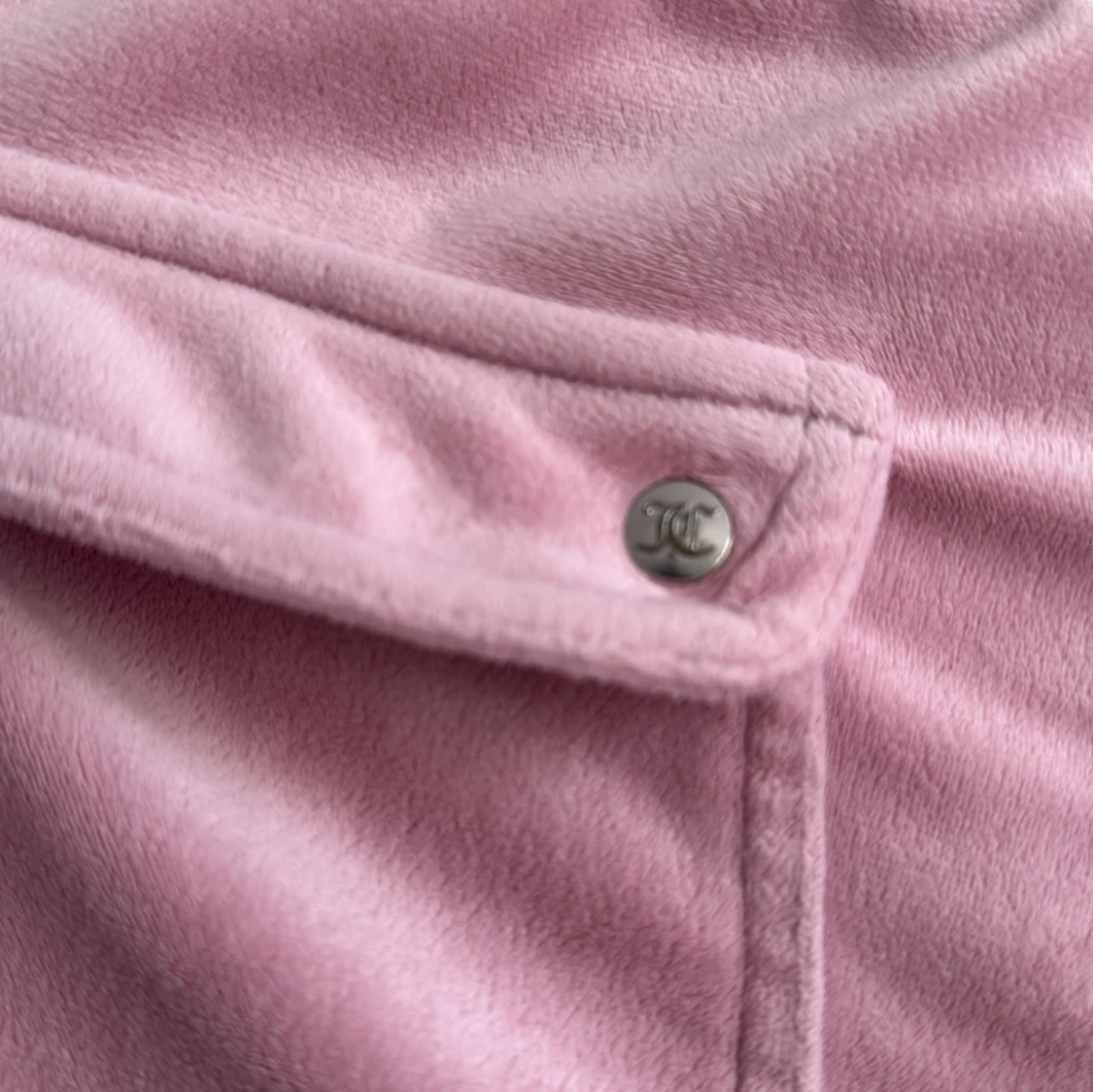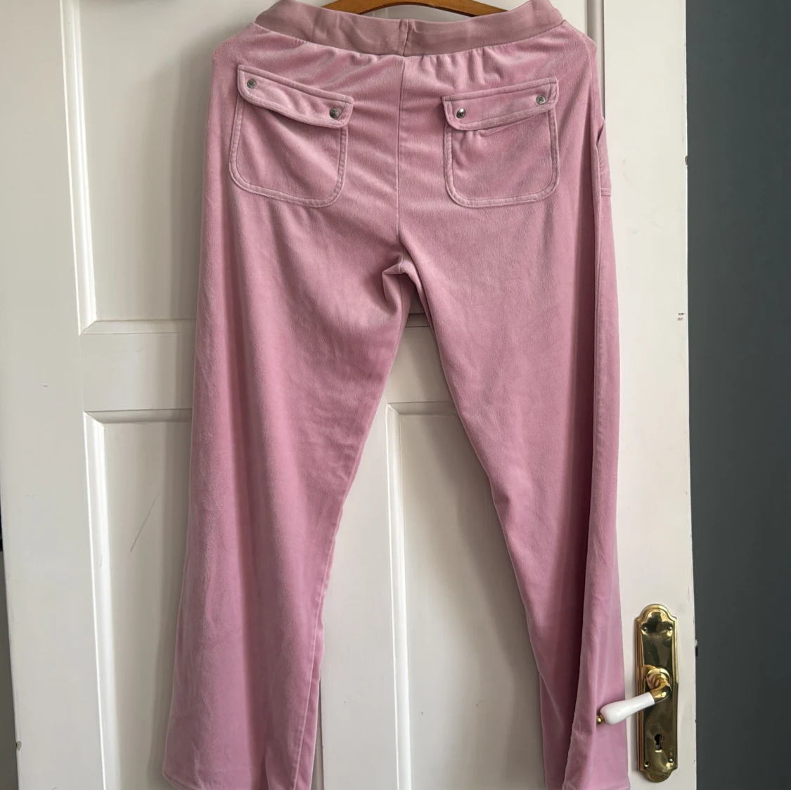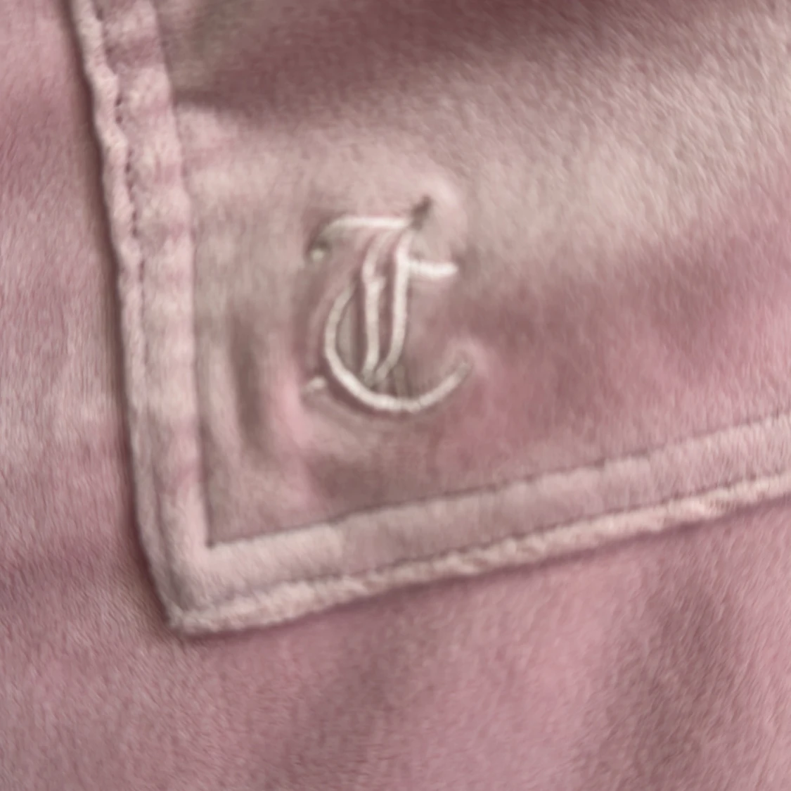 Mysiga rosa mjukisbyxor från Juicy Couture i velour med bred resår i midjan, stora fickor fram och bak samt broderad JC-logga på ena fickan. Perfekta för en chill och trendig look.