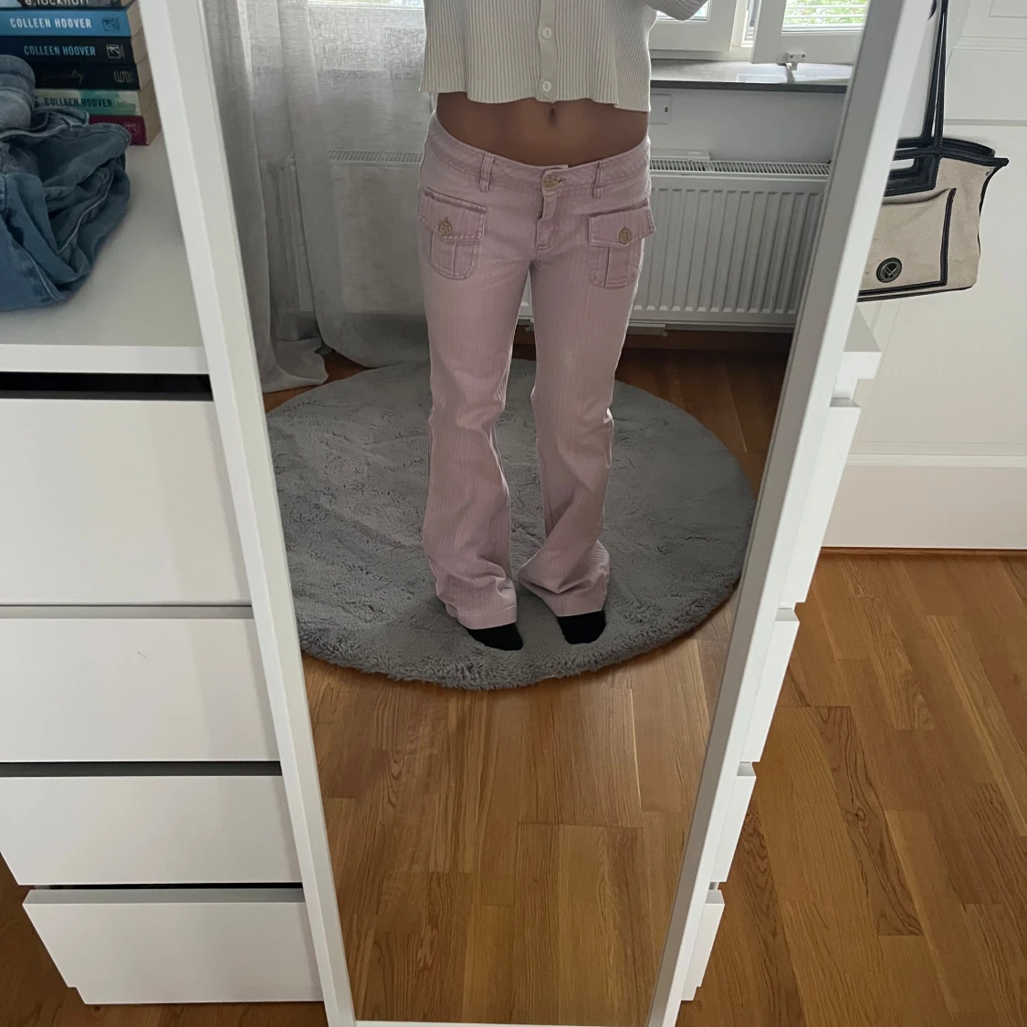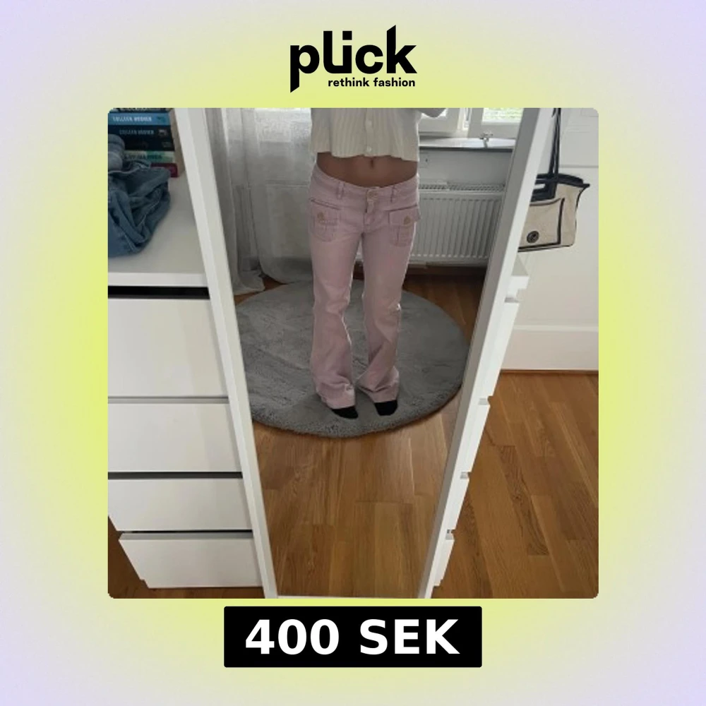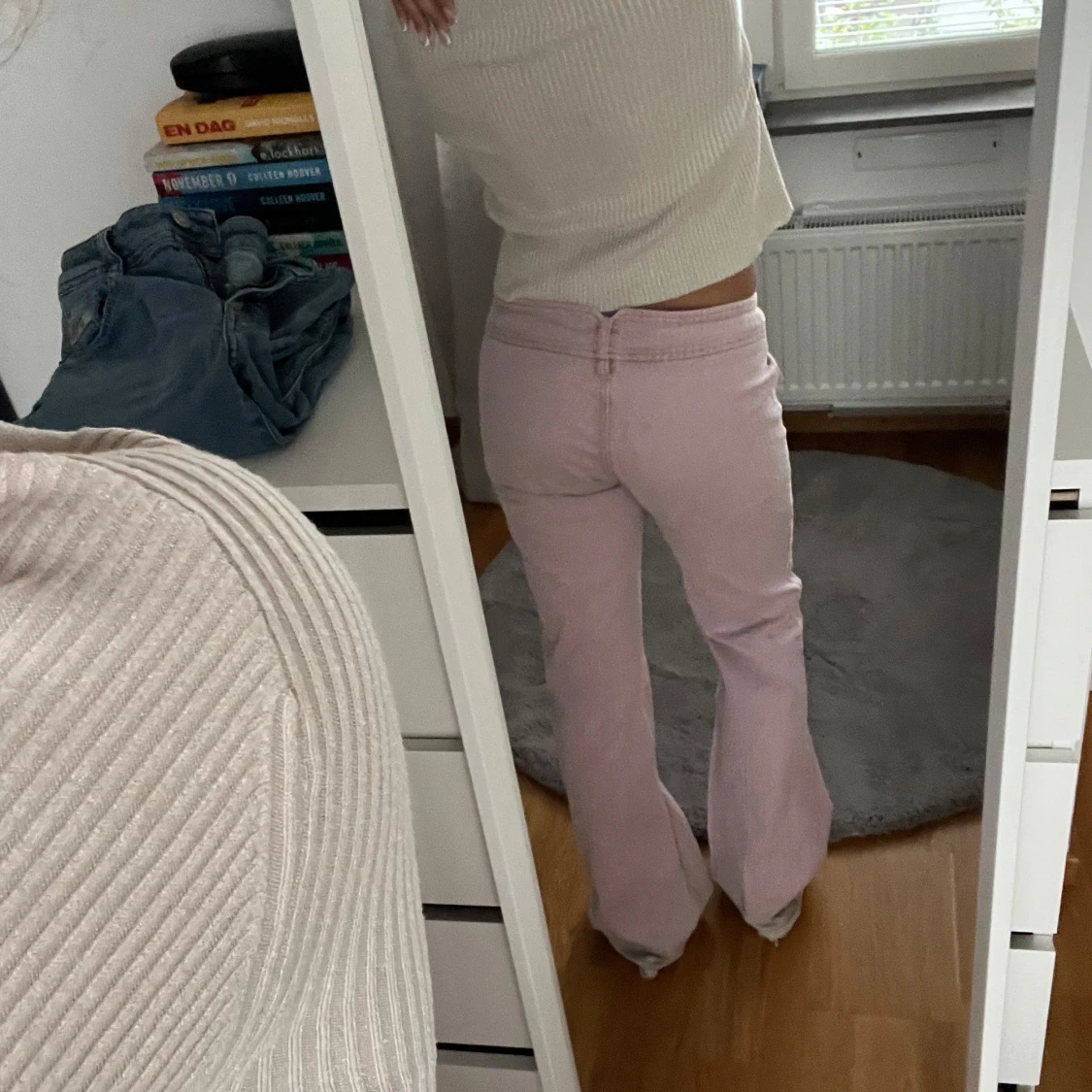 Säljer dessa ljusrosa bootcut jeans från märket Sfera, de är i storlek 40 står det men sitter såhär på mig som normalt är 34/36, och därmed skriver jag att de är storlek 36/38 för det är min uppfattning. Det syns att de har vart använda.