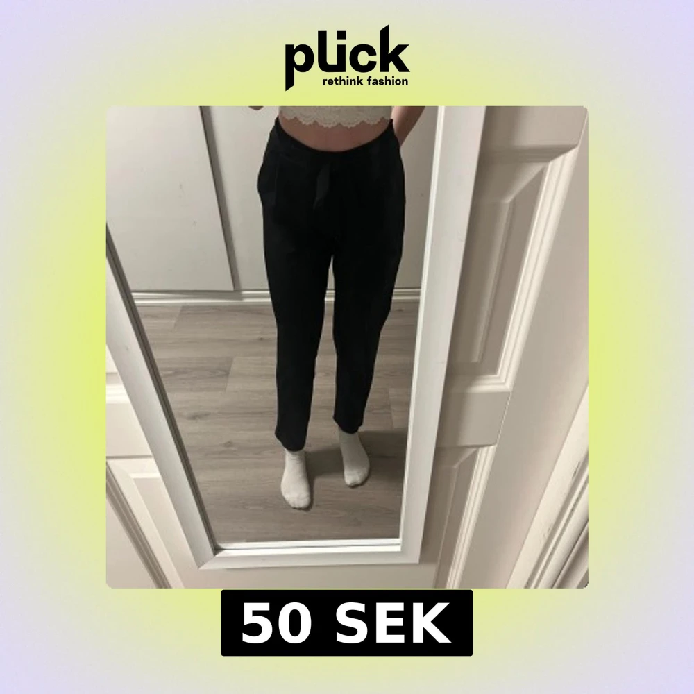 Snygga svarta byxor med hög midja och knytband i midjan. Byxorna har en loose passform och är tillverkade i ett mjukt material som ger en bekväm känsla. De är använda och lite noppriga