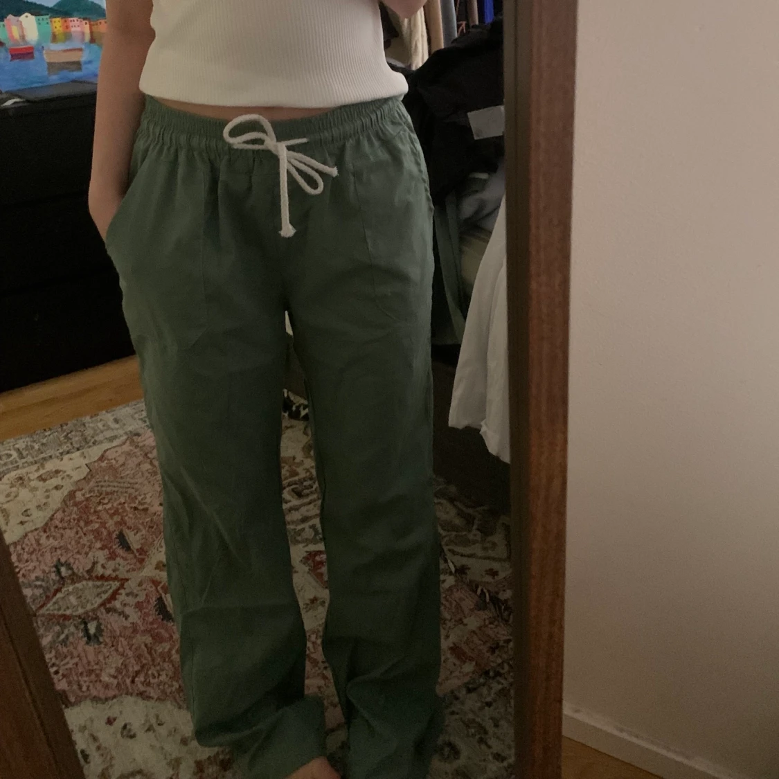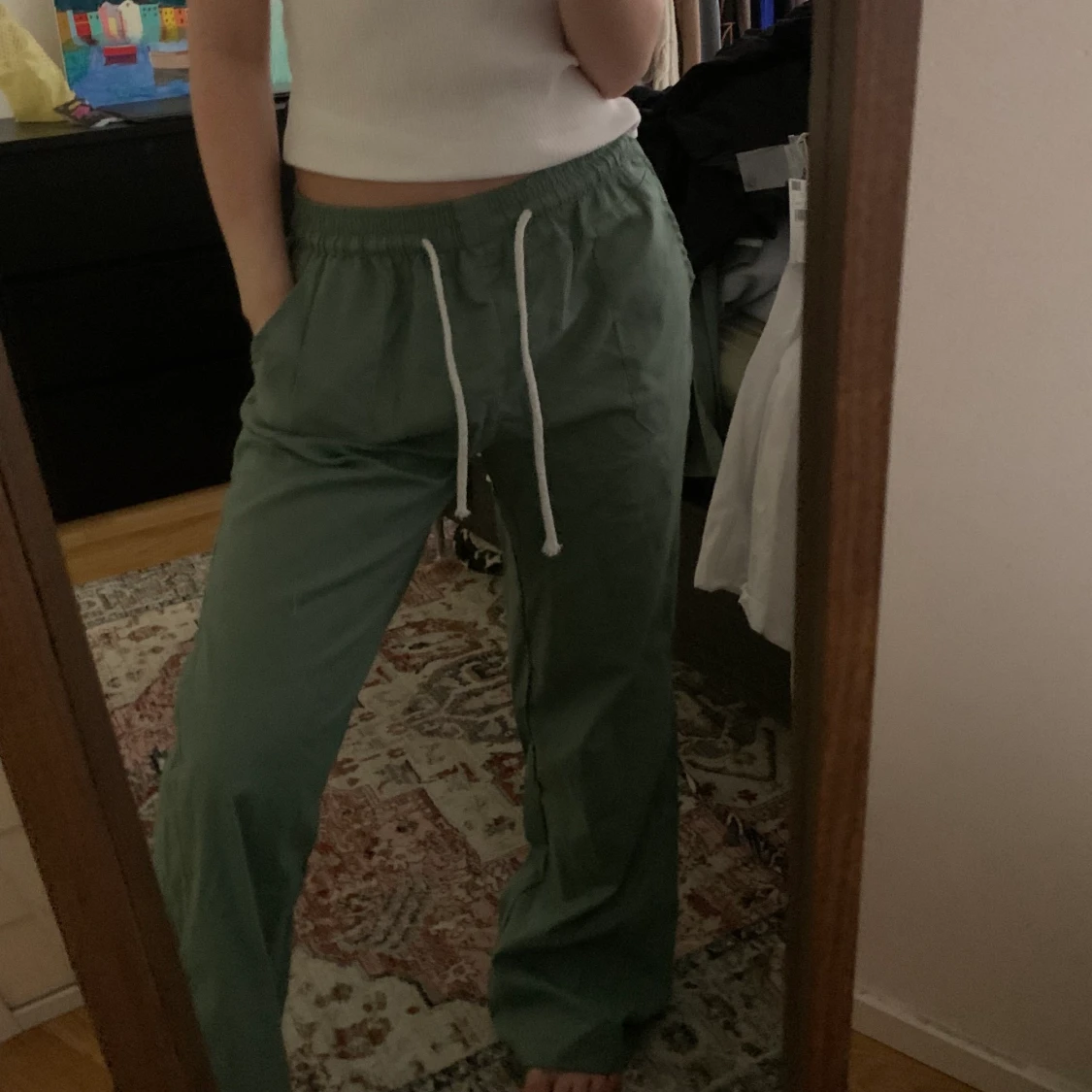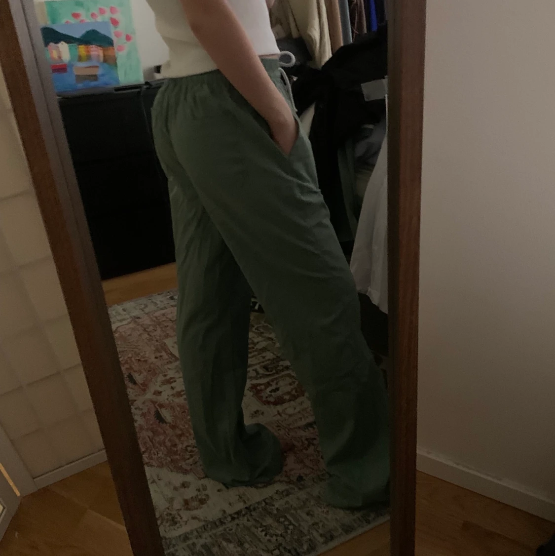 Gröna byxor som är väldigt lika linnebyxor men det här är lite plastigare material. Sitter superfint, man kan ha dom både högmidjat eller dra ner dom lite så dom blir midrise. Kör budgivning på dom💕