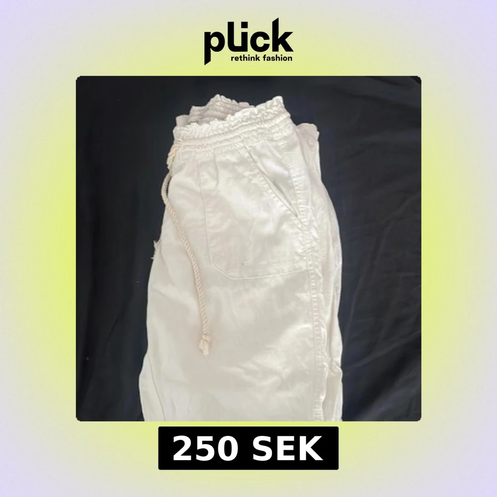 Säljer ett par vita linnebyxor från Roxy med bred resår i midjan och grov snörning framtill. Byxorna har stora fickor på sidorna och är tillverkade i ett lätt och luftigt linnematerial, perfekta för varma dagar. Ena snöret har blivit lite konstigt där av priset förutom de är skicket väldigt bra då de knappt har använts.