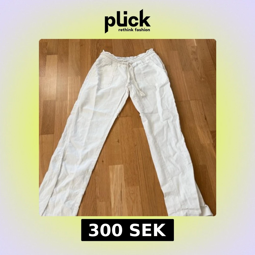 Snygga vita linnebyxor från Roxy i storlek XS. Byxorna har elastisk midja med snörning och två fickor fram. Perfekta för chill dagar och har en avslappnad passform med raka ben. Lätta och luftiga i linne för en fräsch look. Som nya, säljer pga för små