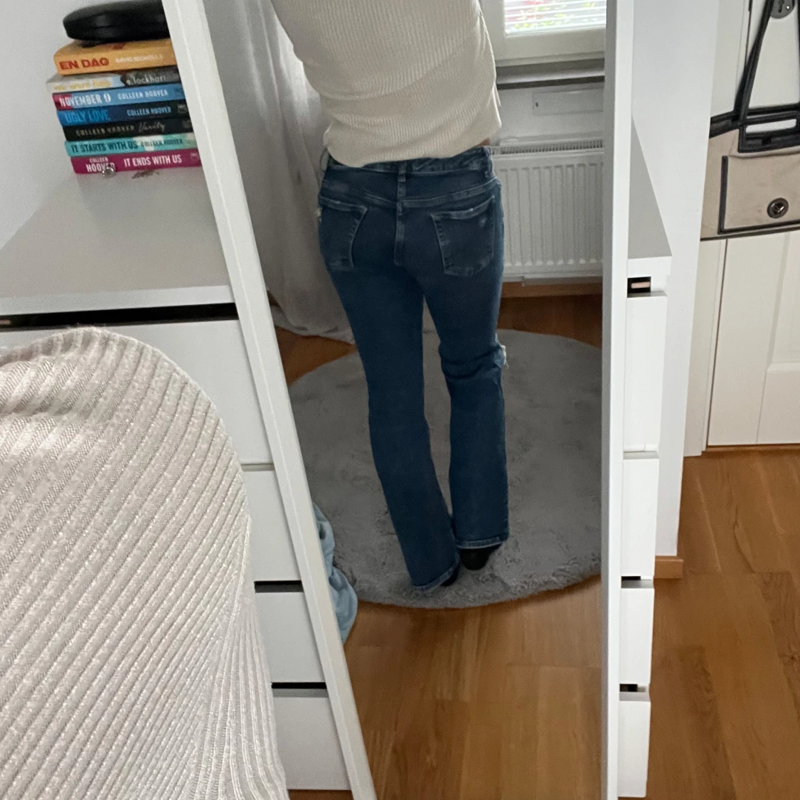 Säljer ett par blå bootcut jeans från LTB i modellen ”Roxy” med snygga slitningar och hål på ena benet. Jeansen har klassisk femficksdesign och låg midja. Perfekta för dig som gillar en avslappnad och trendig look.