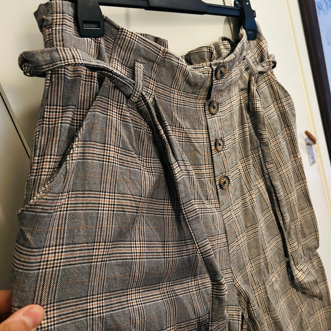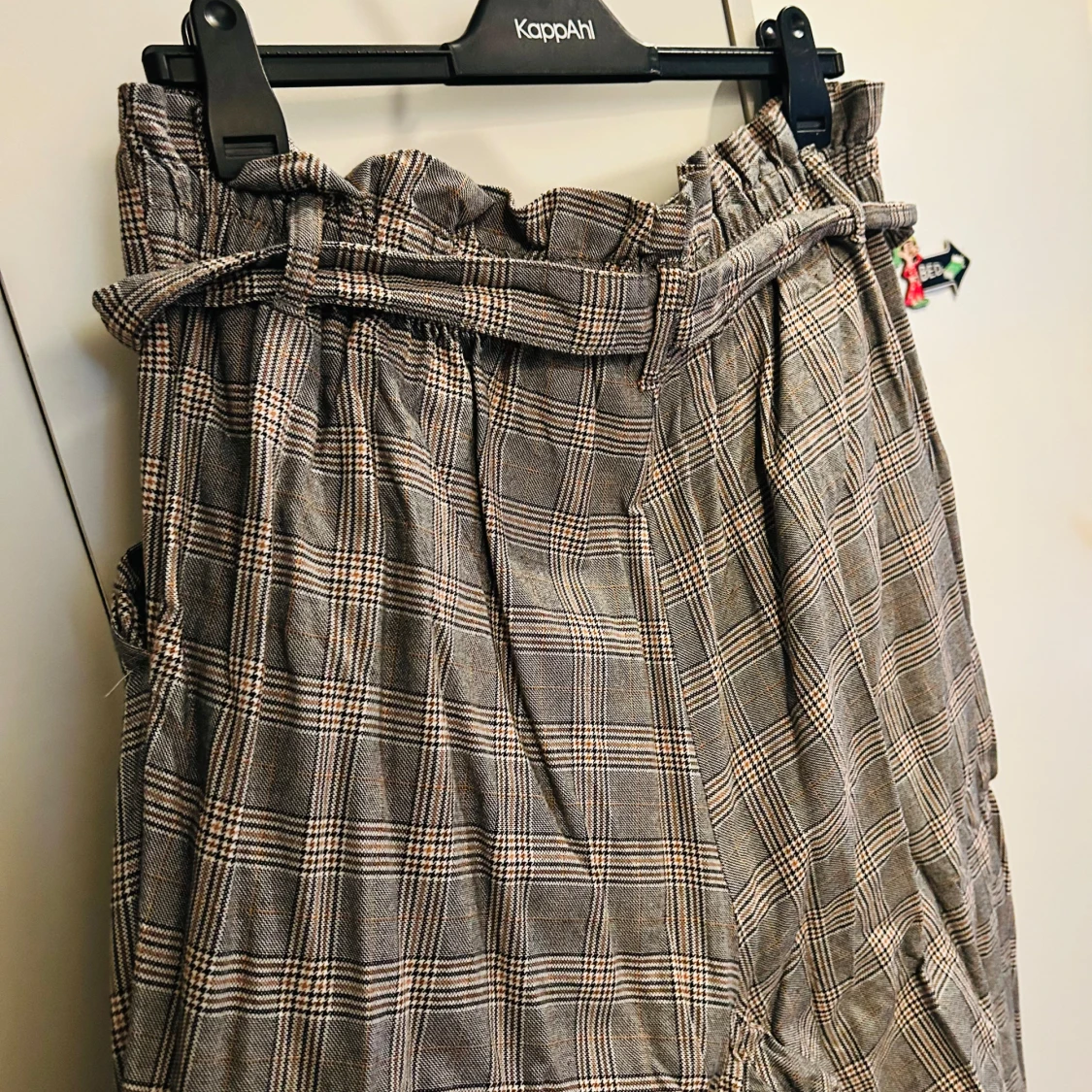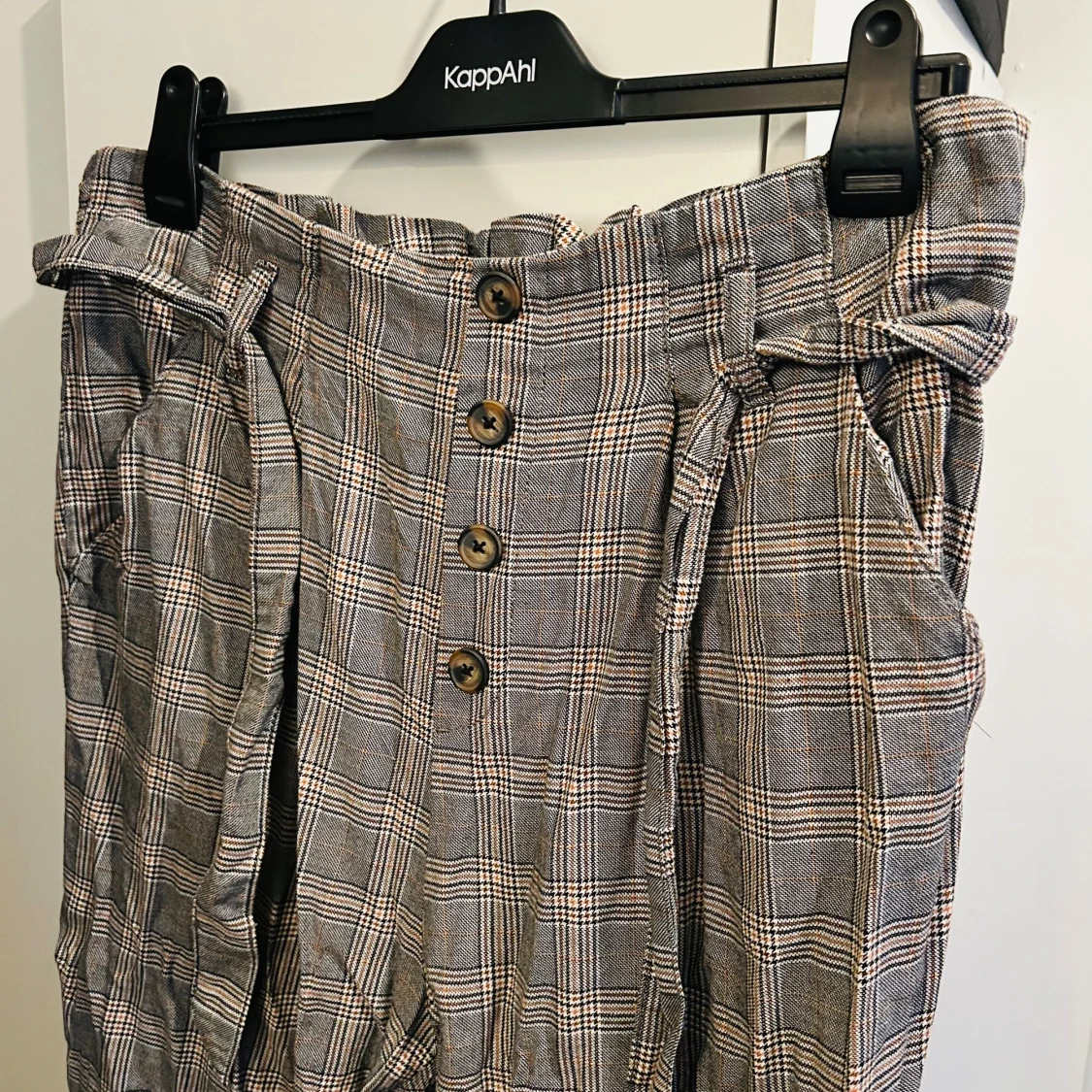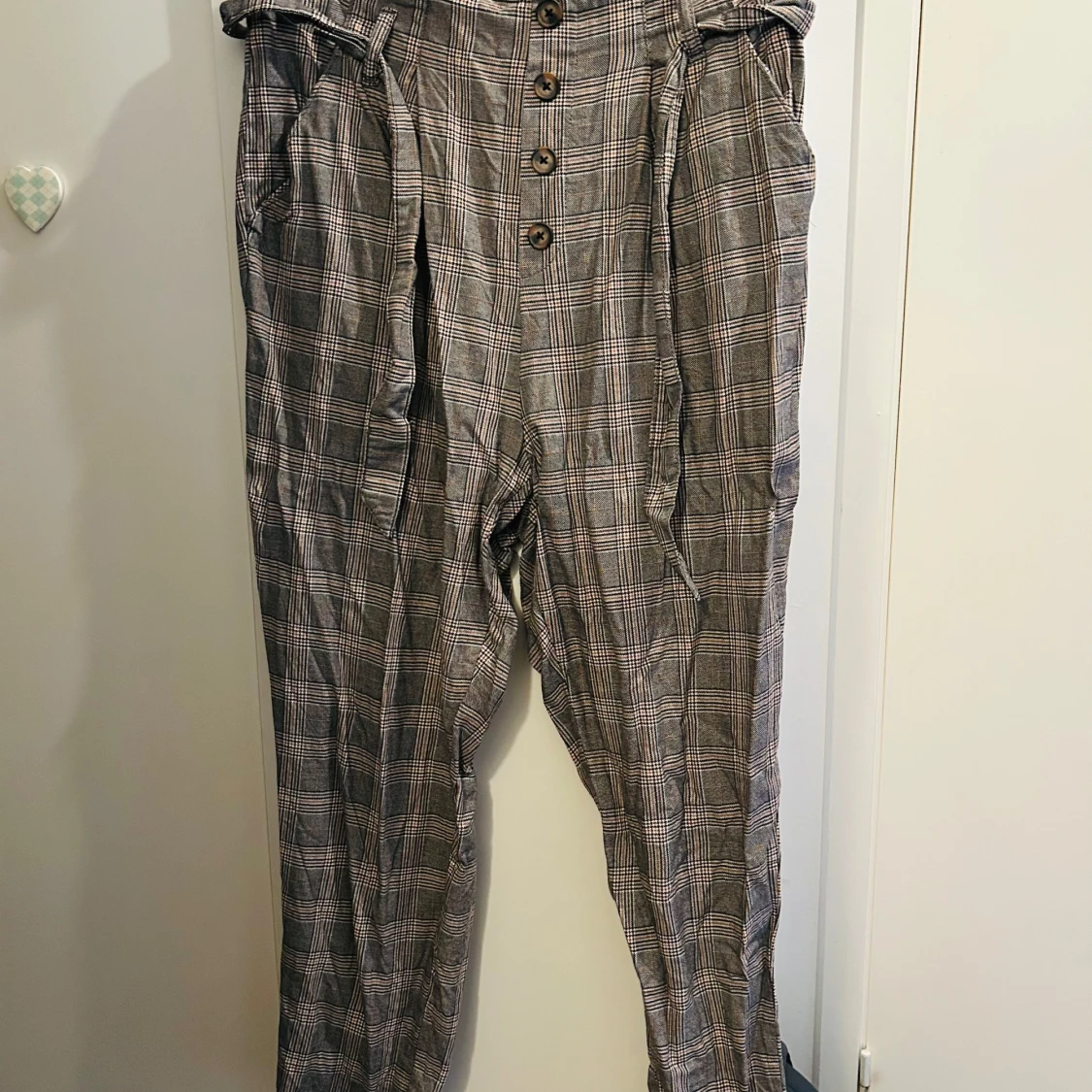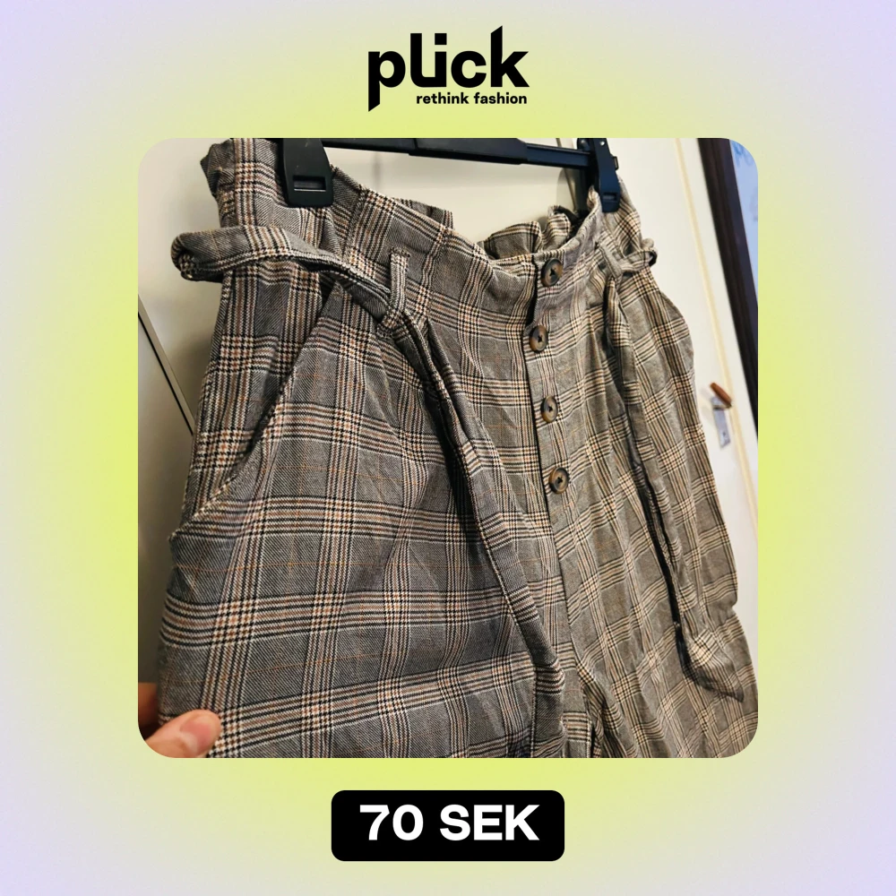 Säljer en superfin rutig byxa från H&M i storlek XL. Byxorna är högmidjade med knappar framtill och ett matchande bälte. Perfekt för höst och vår med sitt klassiska rutmönster i grått och beige. Tillverkad i 100% bomull vilket gör dem både bekväma och stiliga. Passar perfekt för en chic vardagslook!