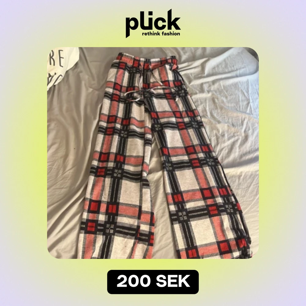 Säljer ett par superbekväma och stiliga byxor med rutig design i svart, röd och vit. De har en loose passform och är perfekta för en avslappnad look. Byxorna har snörning i midjan för justerbar passform.