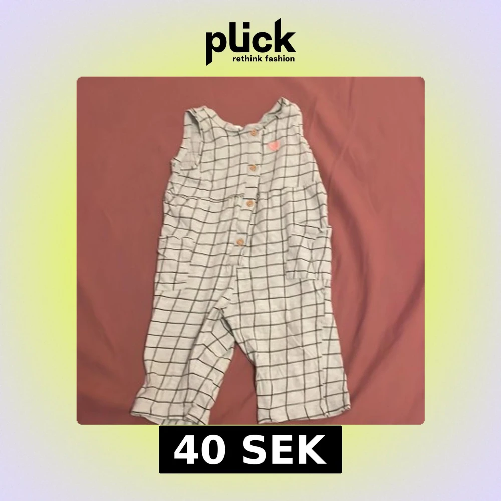 Supersöt ärmlös byxdress från H&M i vitt med svart rutmönster. Byxdressen har knappar framtill, två fickor på sidorna och en liten rosa hjärt-detalj vid axeln. Perfekt för en chill och lekfull stil till de minsta.