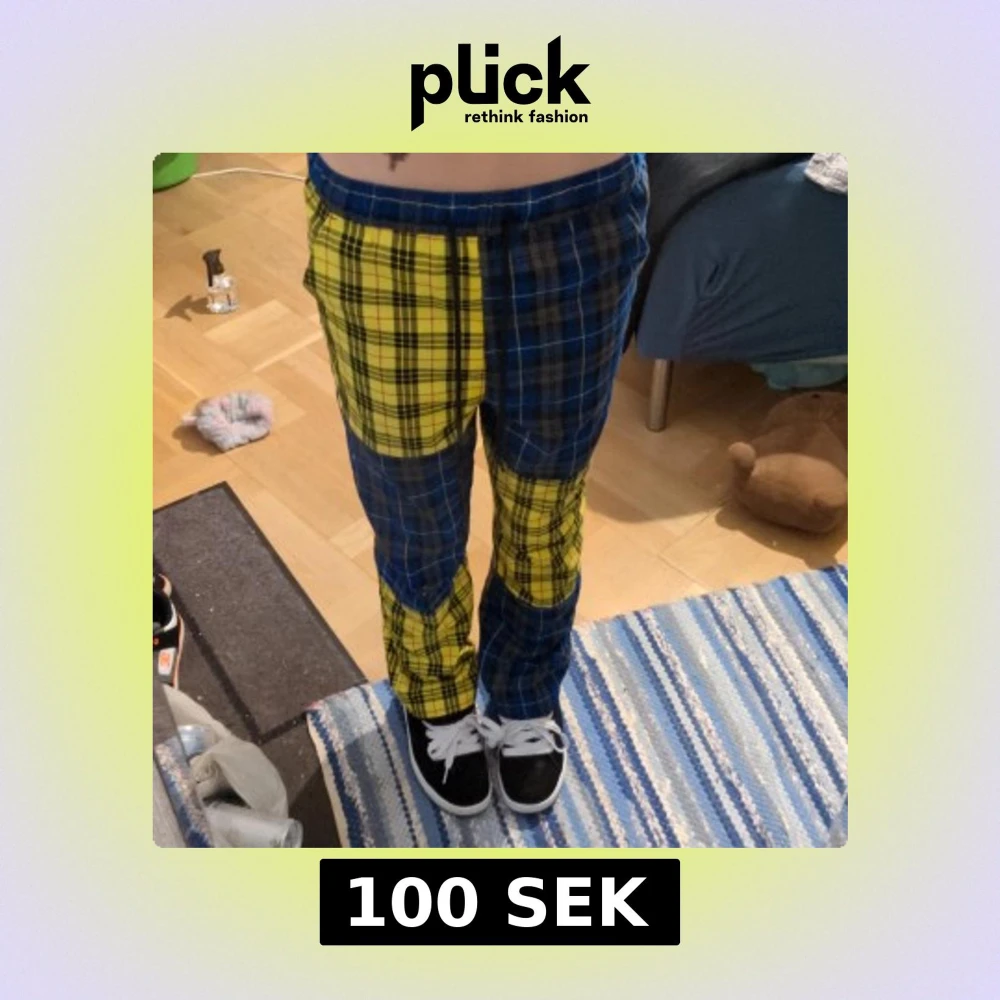 Unika byxor från Collusion i patchwork-stil med rutigt mönster i blått och gult. Byxorna har normal passform, raka ben och midja. Tillverkade i mjukt bomullstyg, perfekta för dig som vill sticka ut med färg och mönster.