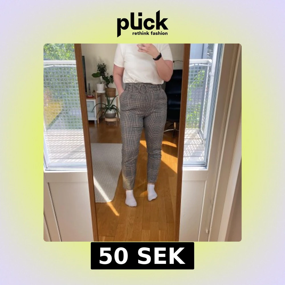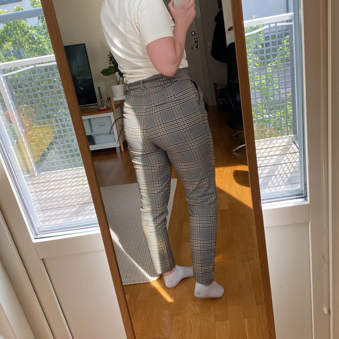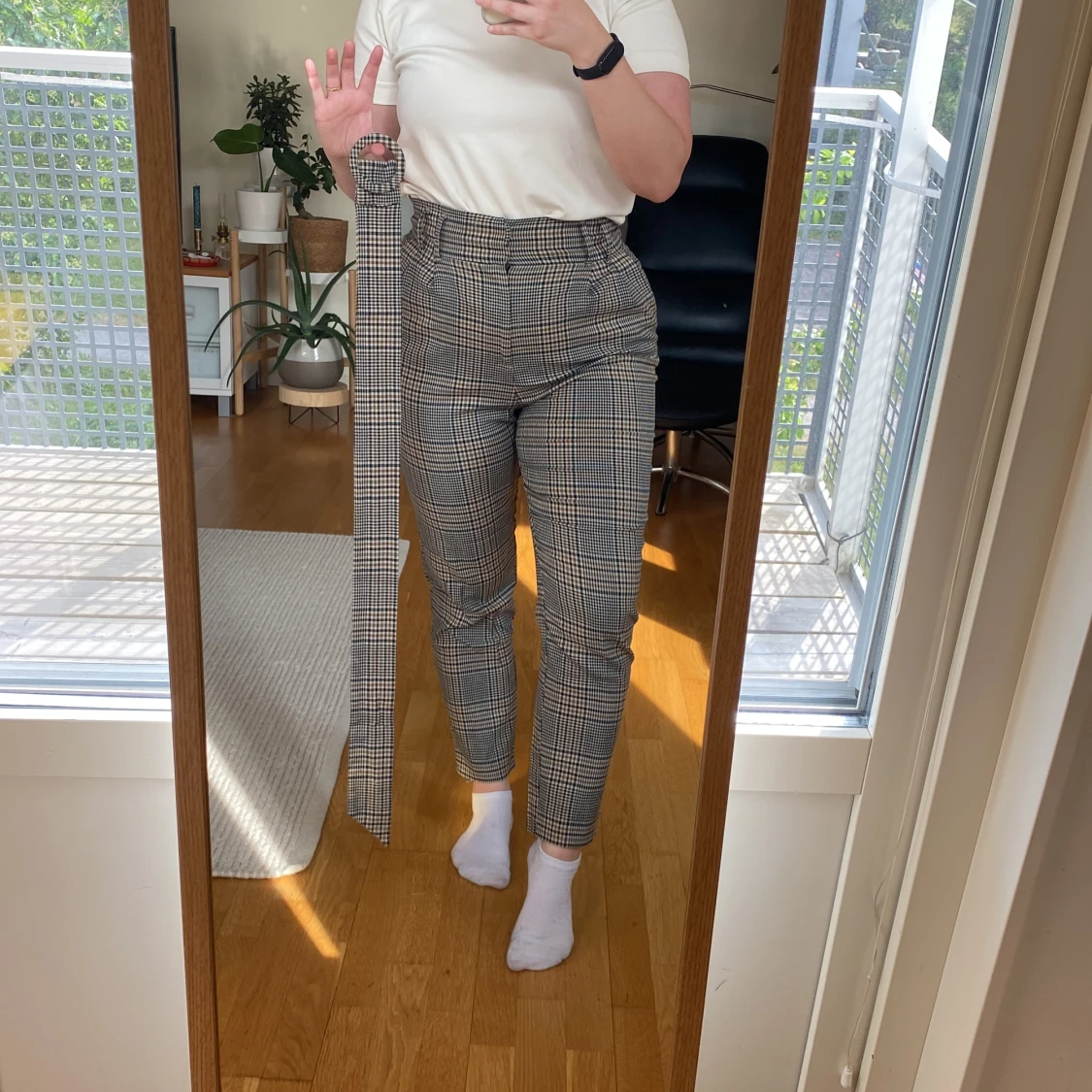 Snygga högmidjade kostymbyxor i rutig design med avtagbart bälte. Byxorna har tapered passform och croppad längd, och är supersköna. Färgerna går i grått, svart och beige. Bra skick men lite noppror på vissa ställen.