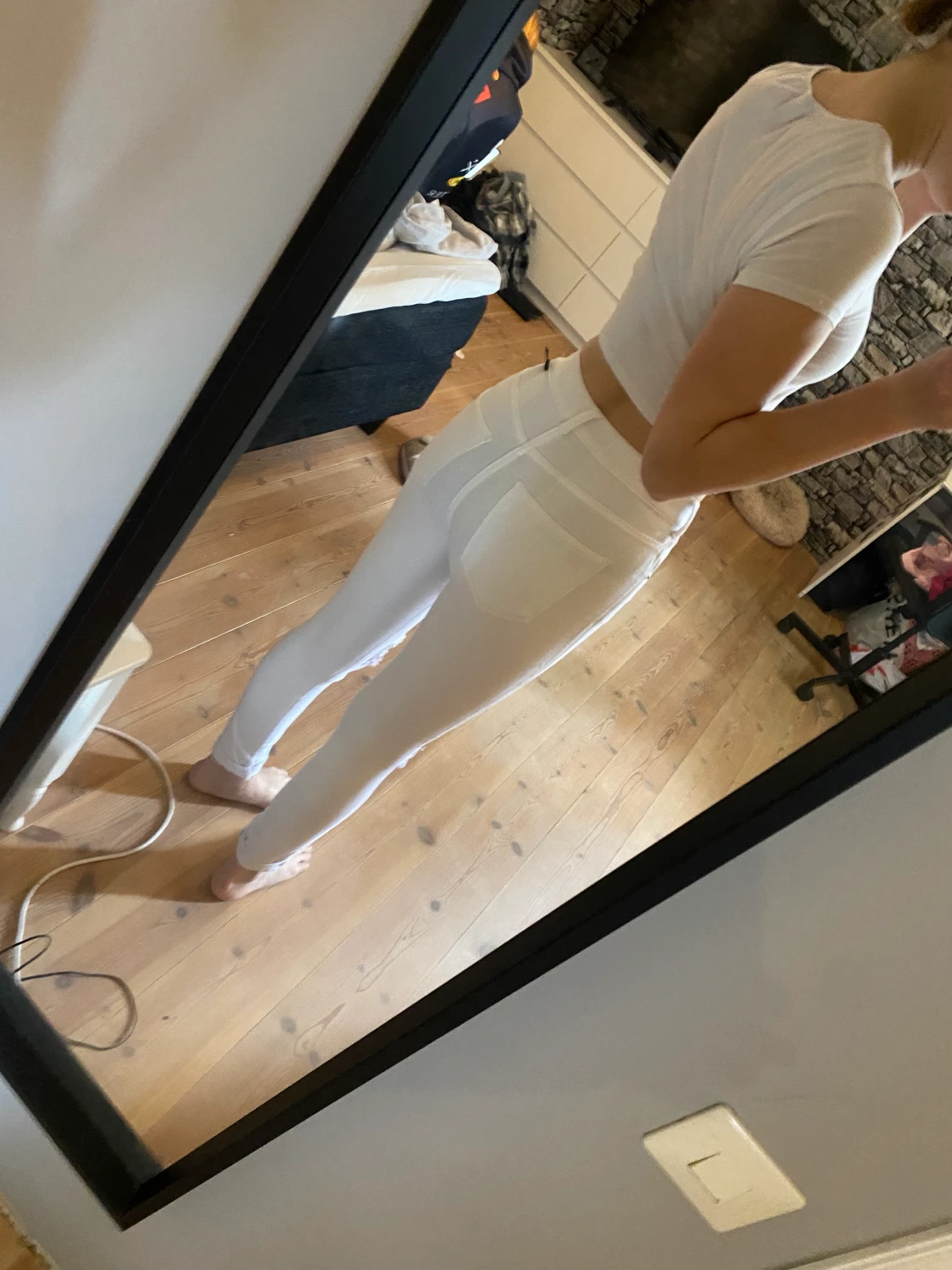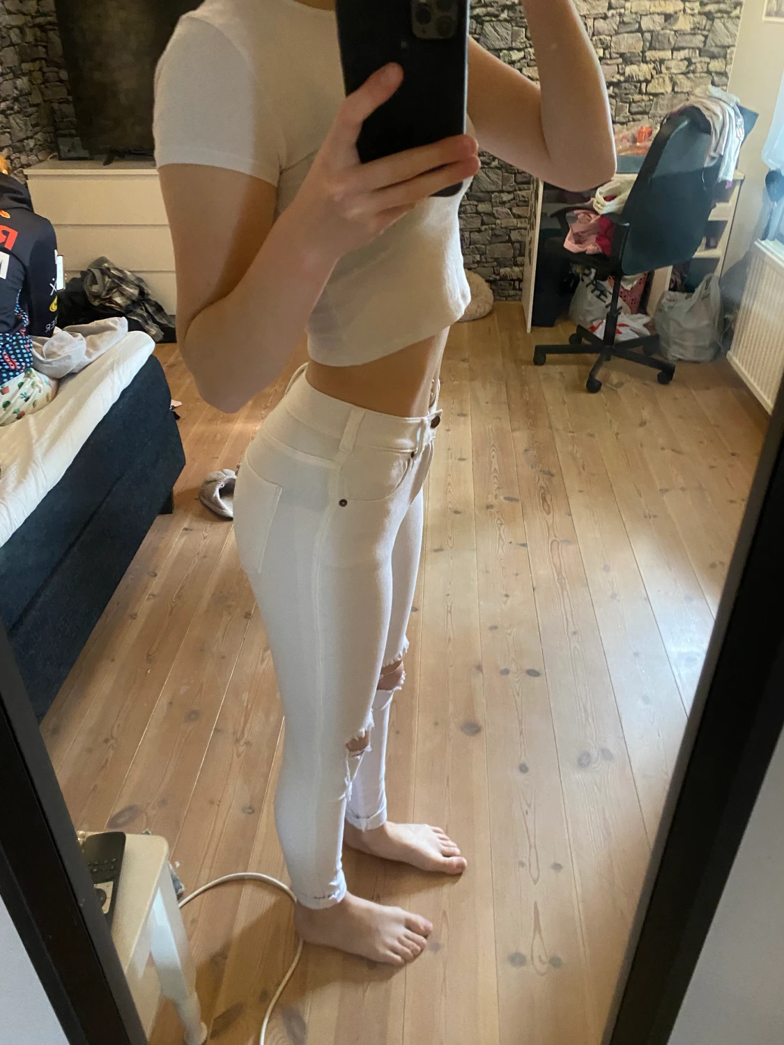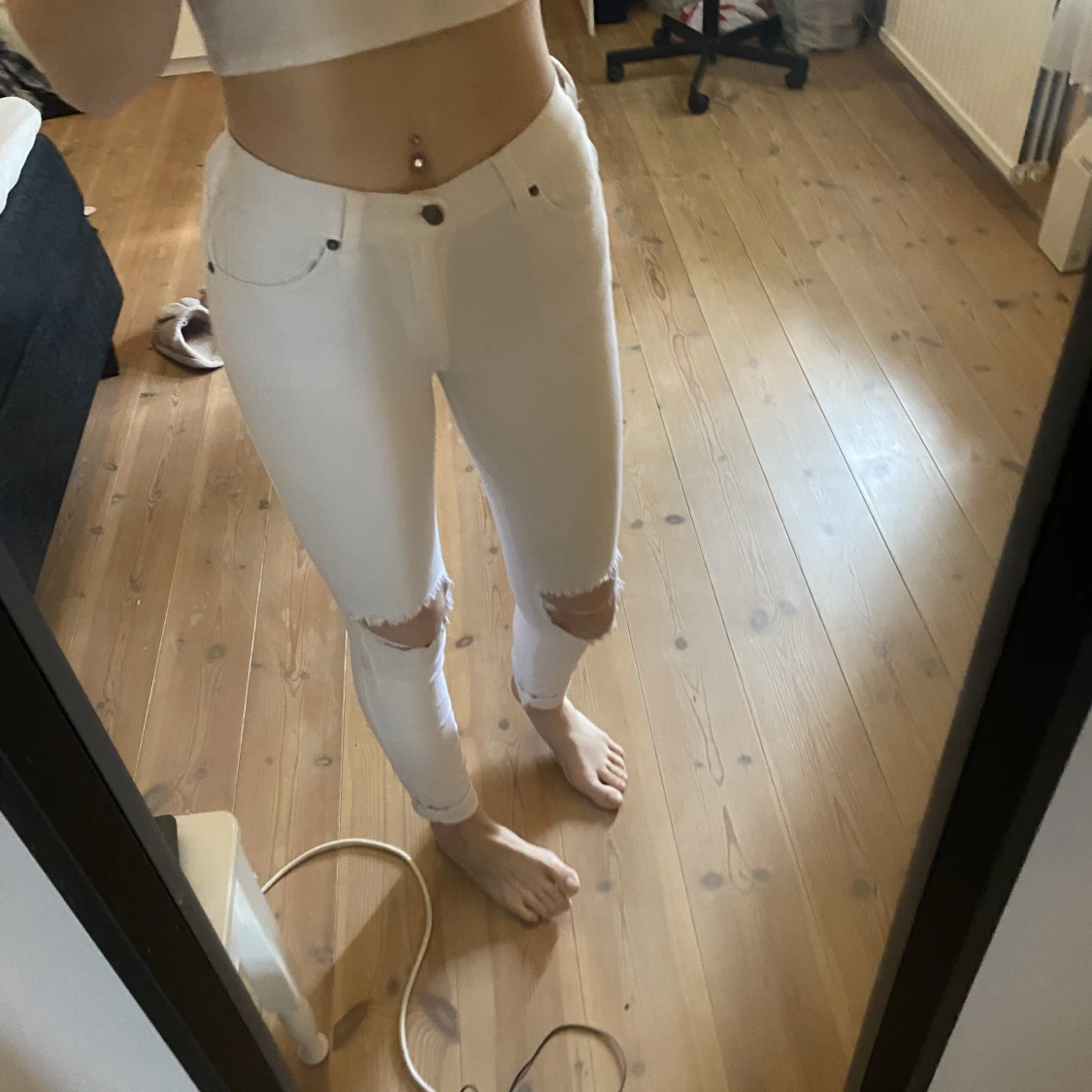 Ett par vita jeans med hål för knäna