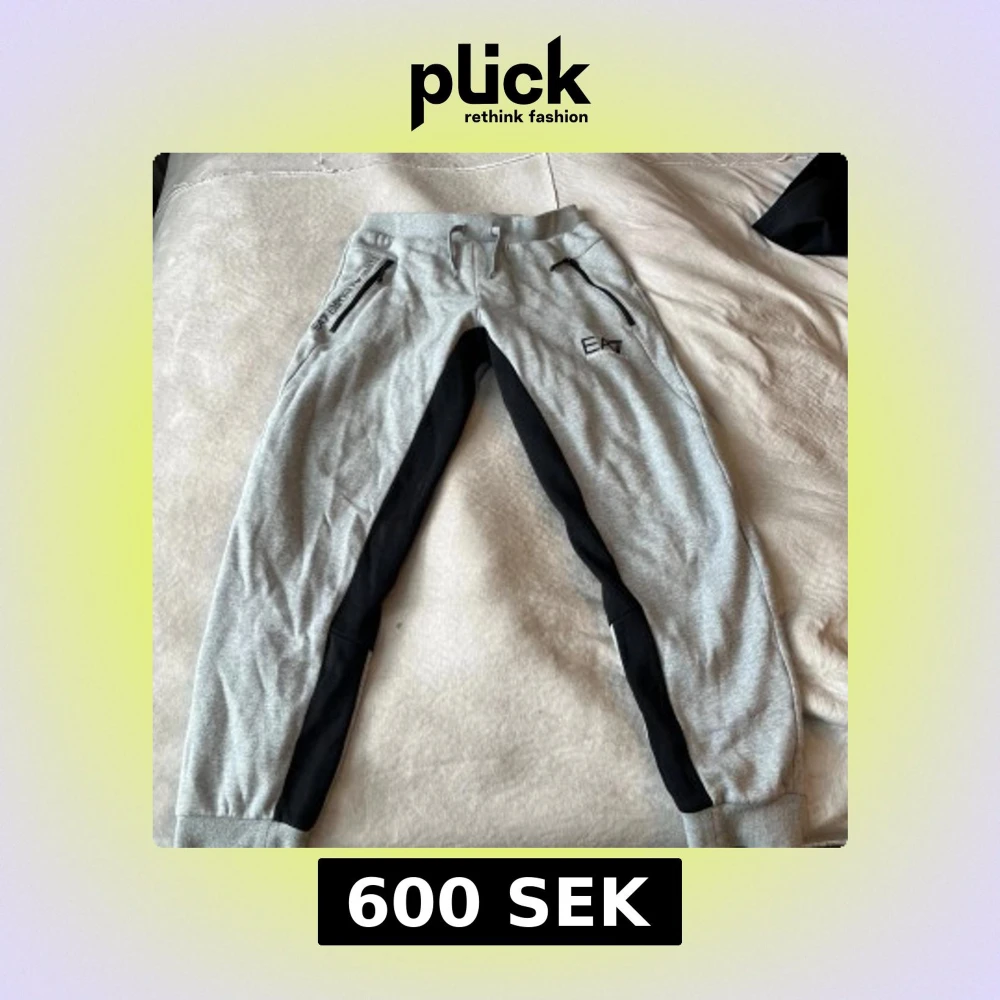 Snygga grå mjukisbyxor från EA7 Emporio Armani med svarta paneler längs benen. Byxorna har snörning i midjan, dragkedjefickor och logga på framsidan. Perfekta för chill eller träning, riktigt sköna och stilrena.